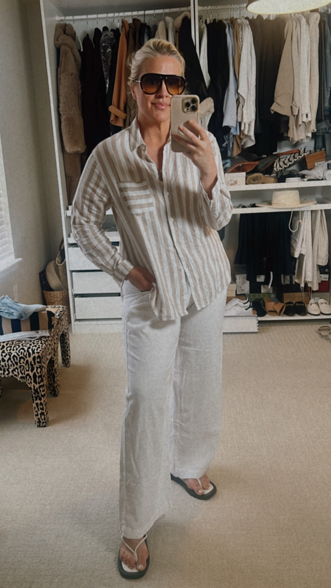 The ensemble exudes a relaxed elegance, with the crisp white palette offering a fresh, clean look perfect for spring or summer. The vertical stripes of the shirt add a visual elongation effect, while the loose-fitting fabrics ensure comfort and add a touch of effortless chic.