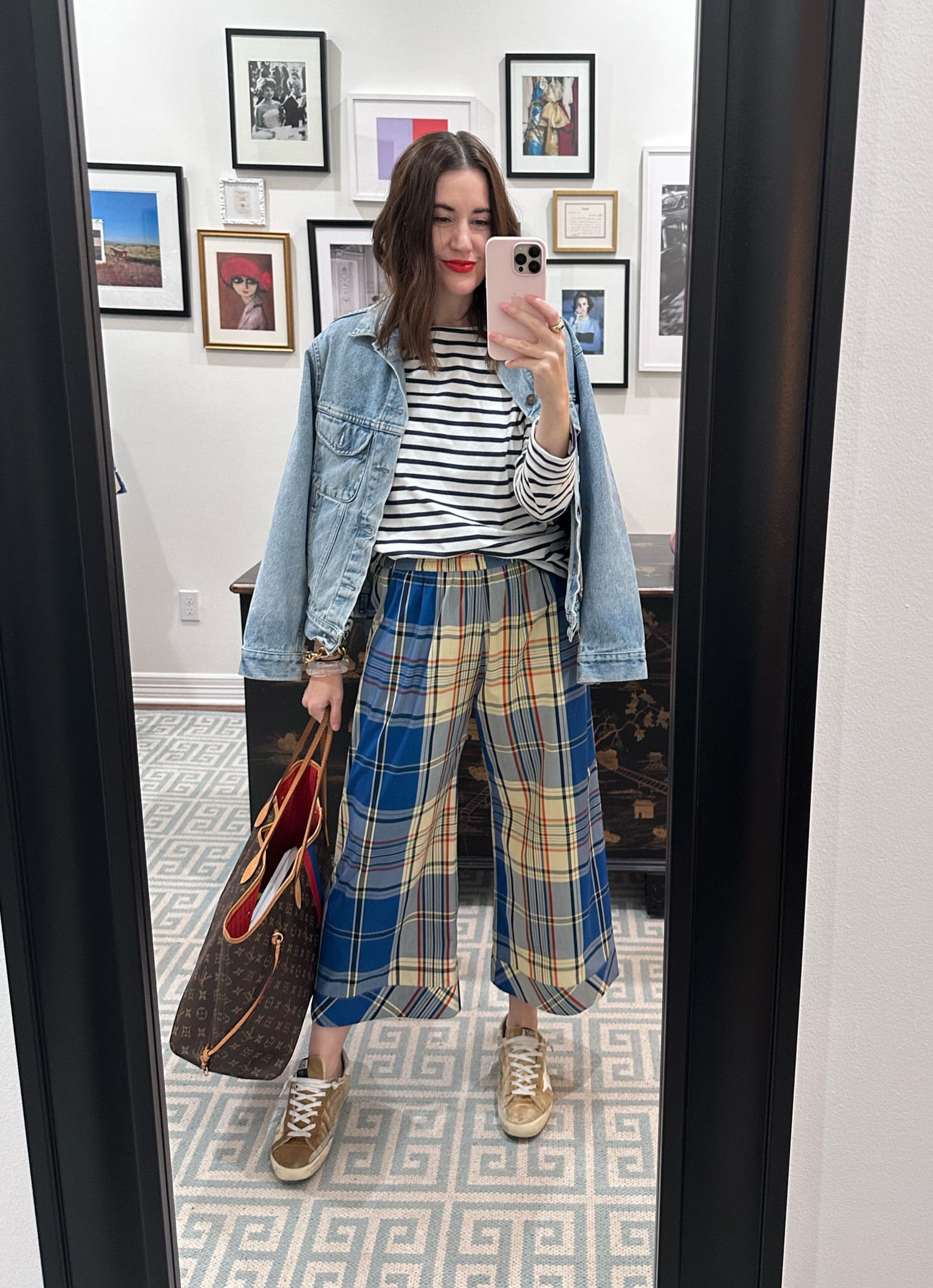 The ensemble effectively plays with layering and pattern mixing, adding depth and interest through the bold striped top and checked trousers. The denim jacket brings a casual, timeless touch, while the sneakers add a comfortable, street-style edge.