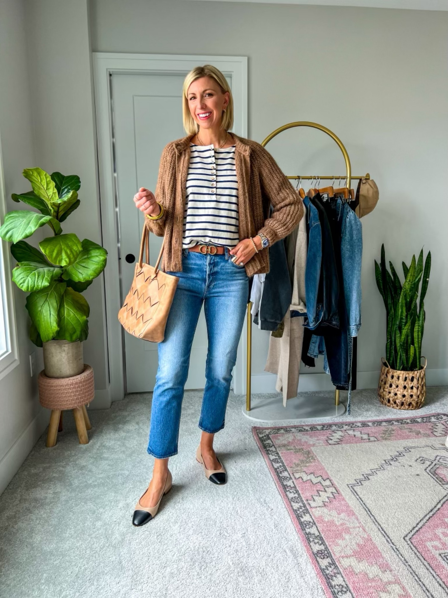 The ensemble presents a chic and casual aesthetic, with the classic striped top and cuffed jeans creating an effortless day-to-day look. The addition of the camel cardigan and coordinated accessories lends warmth and a polished finish to the outfit.