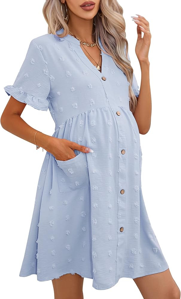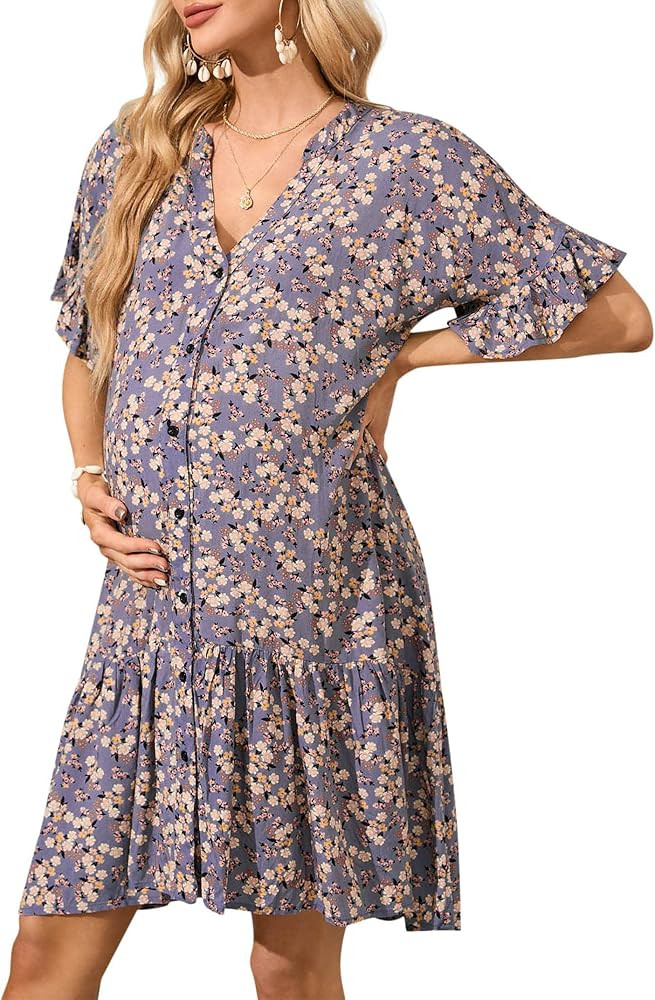 I love how this dress beautifully combines comfort and style, making it perfect for a maternity look. The soft blue fabric with delicate floral prints adds a gentle touch, while the flowing design provides ease and elegance.