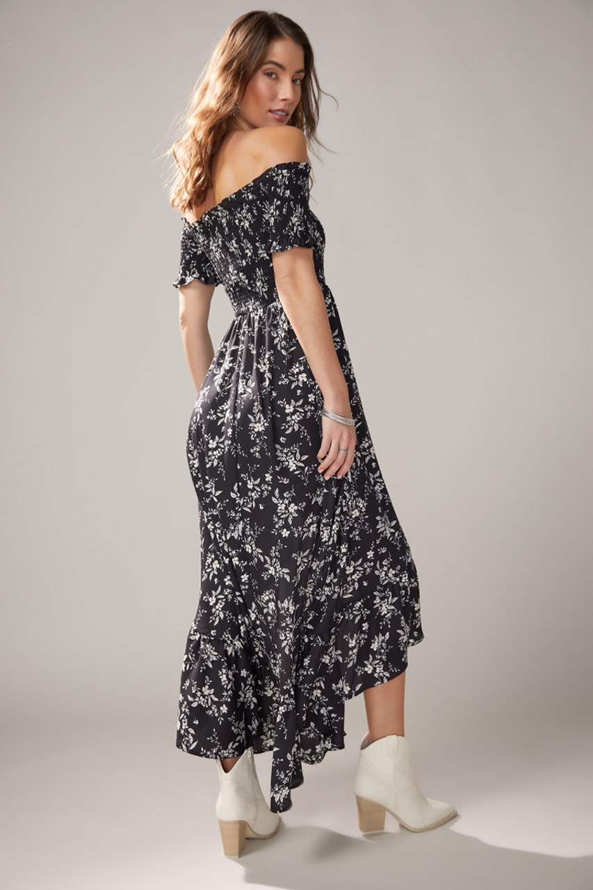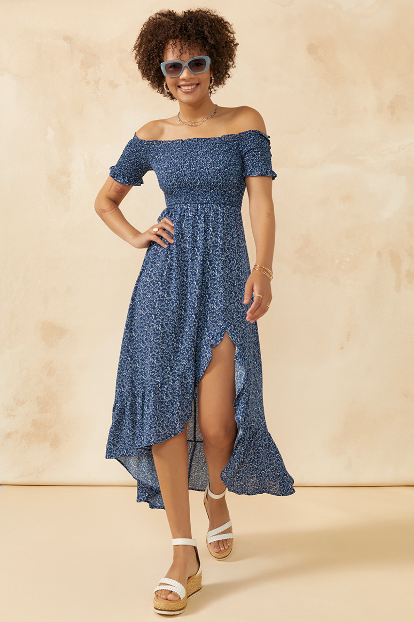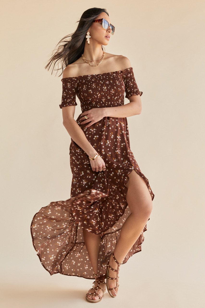 I adore this outfit because the off-shoulder dress perfectly accentuates the figure while exuding effortless elegance. The subtle floral pattern adds a charming, feminine touch that blends seamlessly with the natural setting.