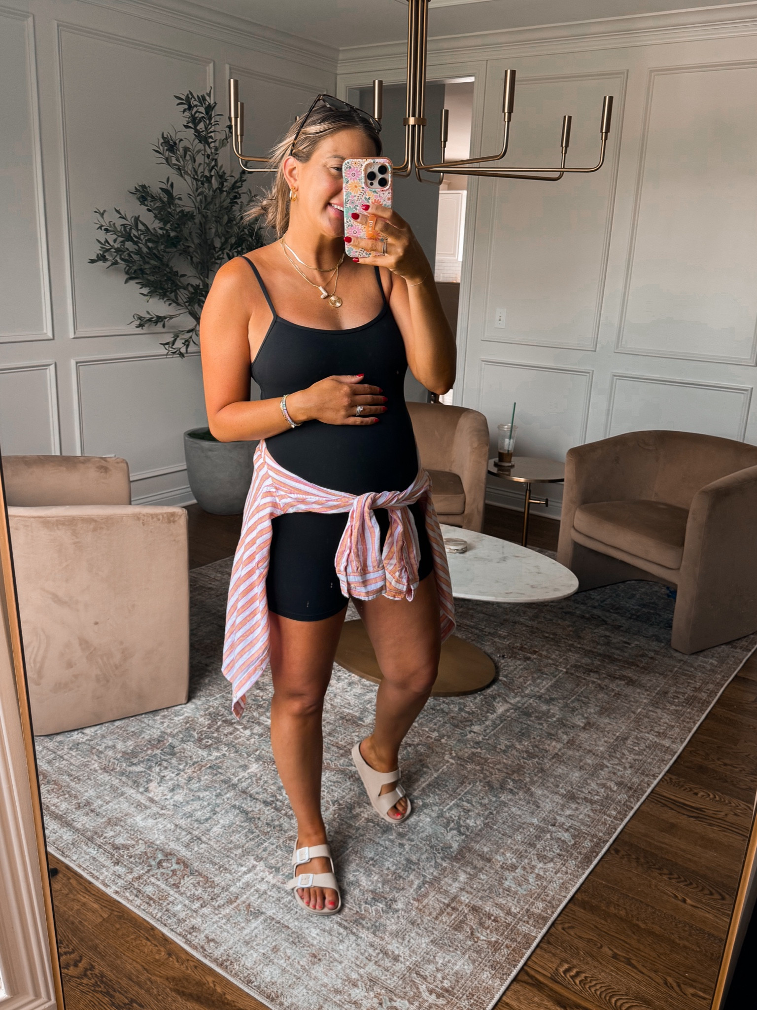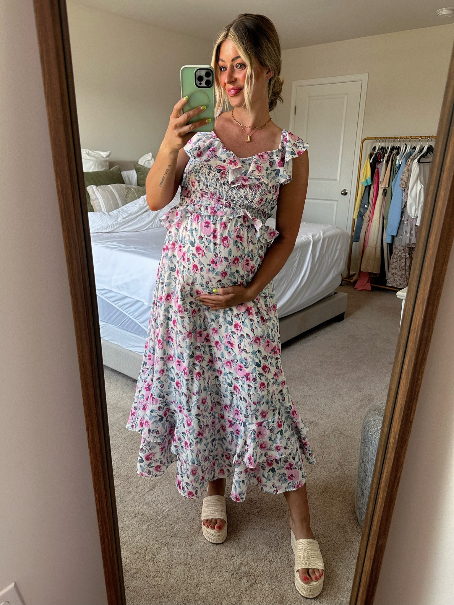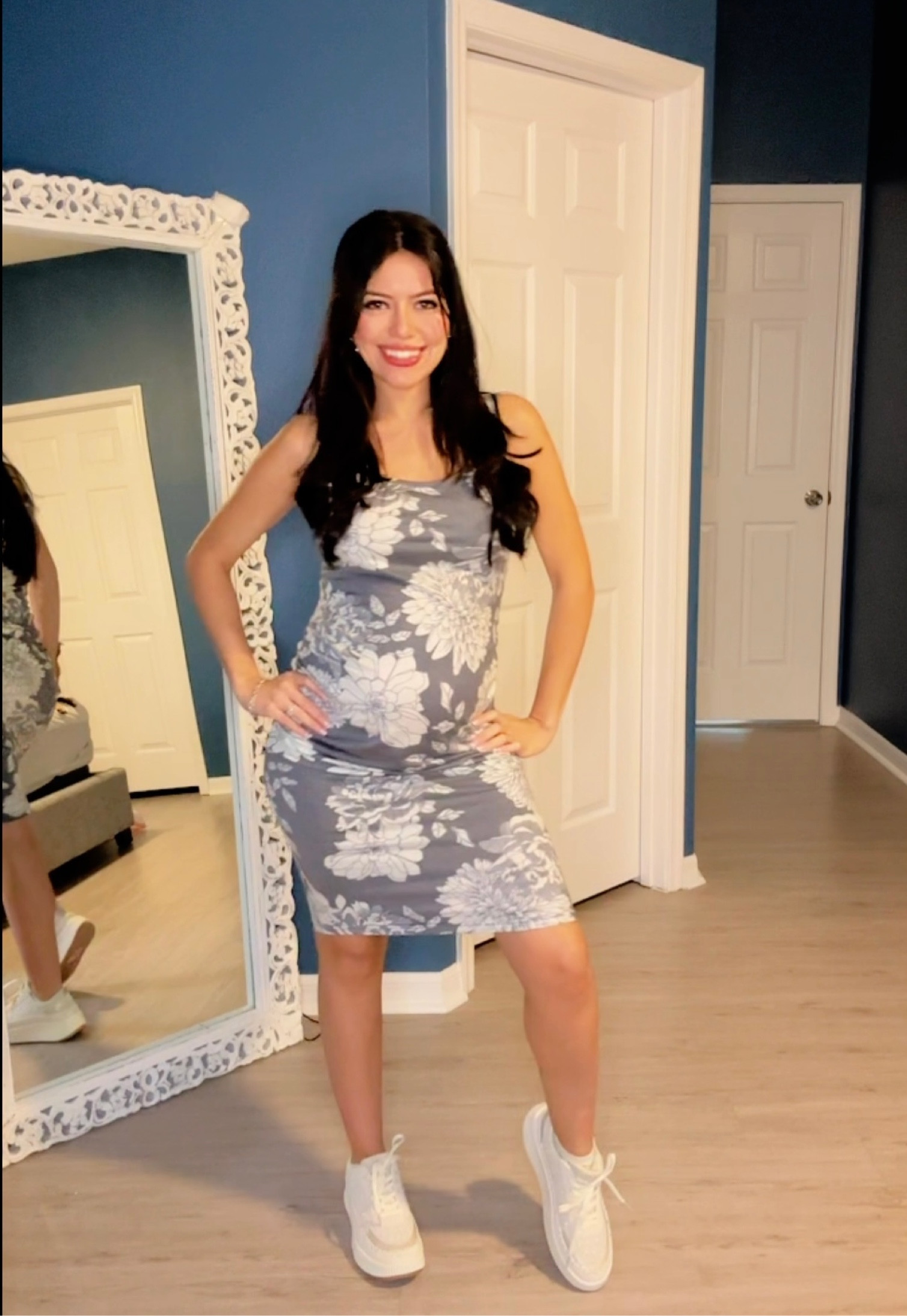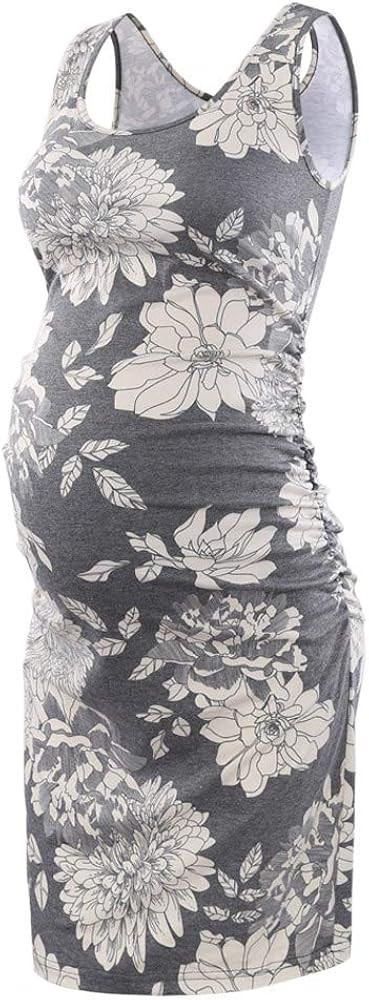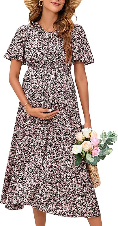 I love this outfit because the floral pattern adds a fresh and feminine touch, while the flowy dress design is both comfortable and flattering for a growing baby bump. The casual sandals perfectly complement the relaxed, yet stylish, vibe.