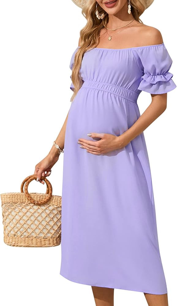 I love how the off-shoulder floral dress beautifully accentuates the bump while providing a stylish, comfortable fit. The soft, pastel colors exude a serene, elegant vibe perfect for maternity wear.