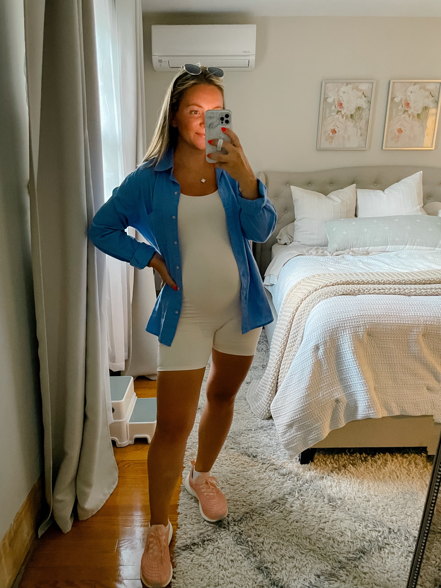 I love how this outfit combines a chic, oversized blue shirt with sleek white shorts, creating a fresh and relaxed vibe. The pink sneakers add a perfect pop of color, making the ensemble casual yet stylish.