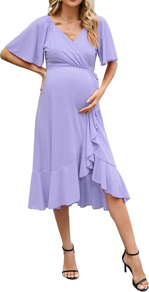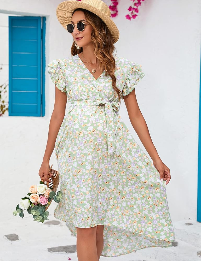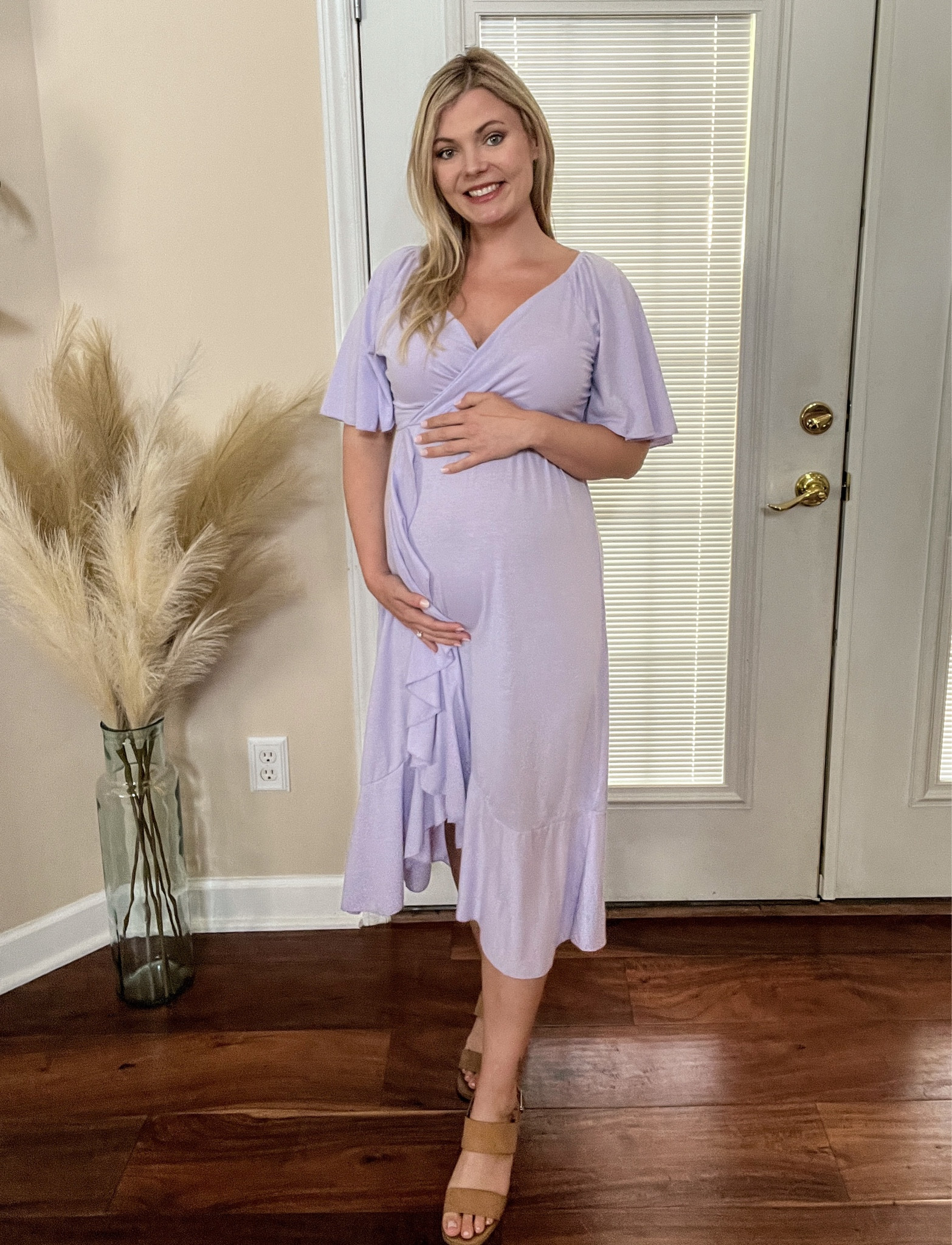 I love the soft lavender dress for its flattering wrap design that beautifully accommodates a growing bump, and the flutter sleeves add a delicate, feminine touch. Paired with chic, comfortable sandals, it’s a perfect blend of style and comfort for an expectant mother.