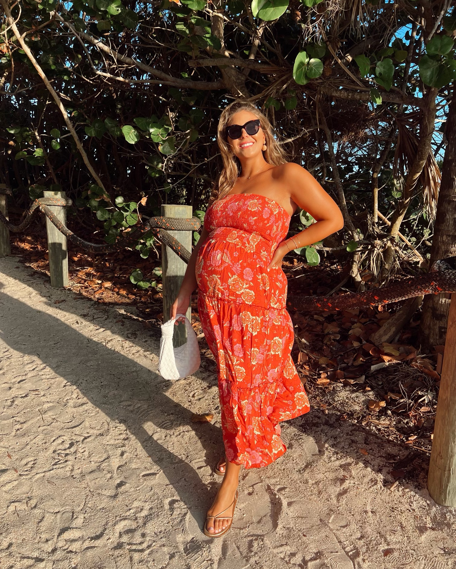 I love how this vibrant floral dress beautifully complements the beach setting, offering both style and comfort. The accessories, like the chic sandals and the white handbag, perfectly enhance the overall summery look.