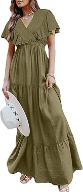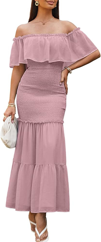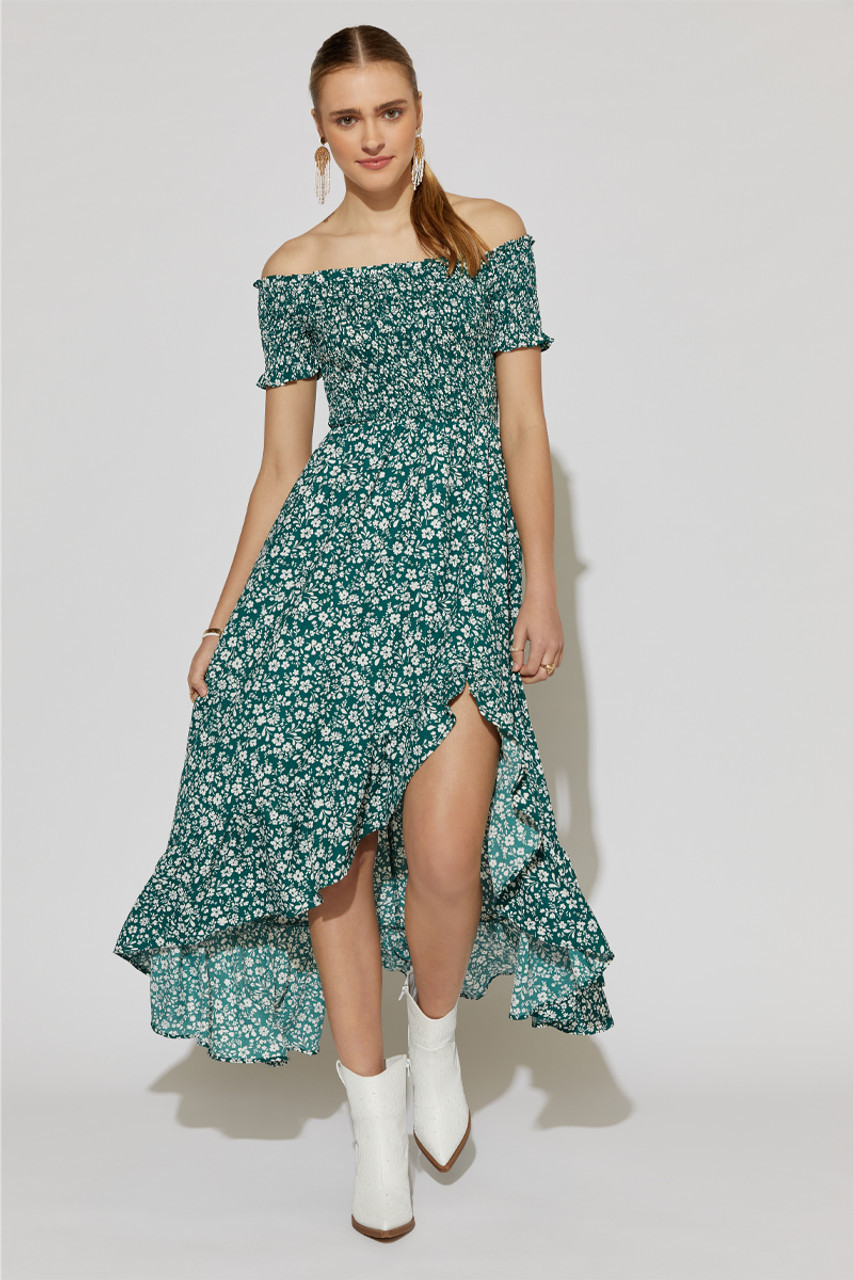 I love how this outfit beautifully accentuates the silhouette with its off-shoulder design and ruffled hem, adding a touch of elegance. The vibrant green color and floral pattern perfectly capture the essence of summer chic.