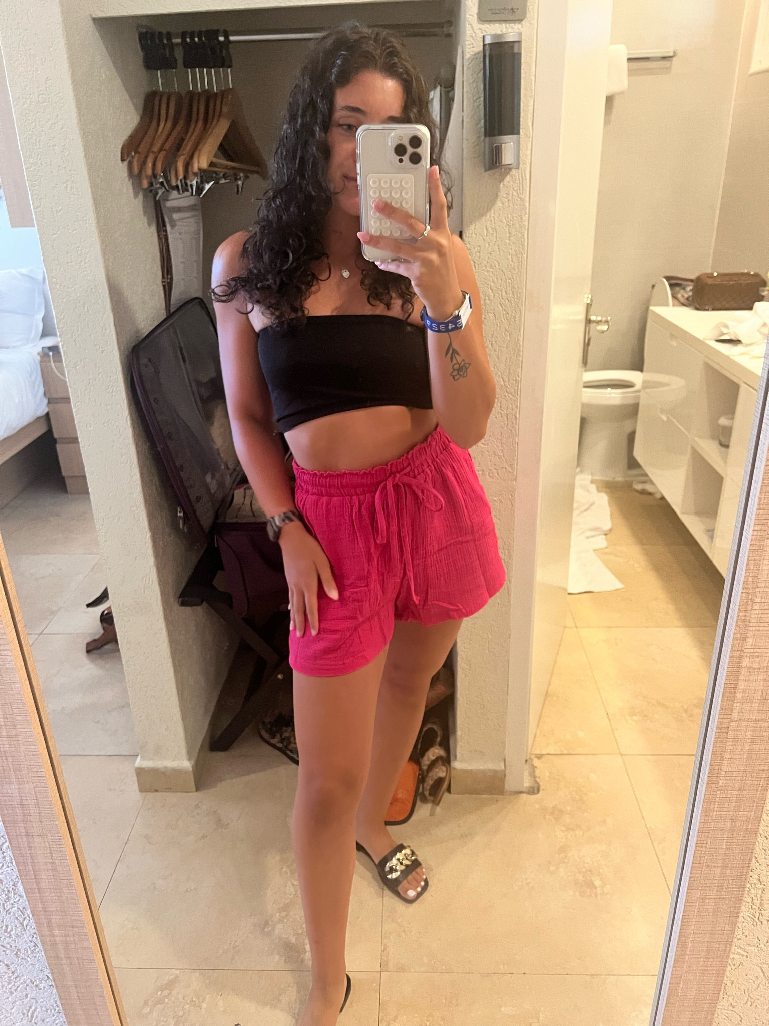 The vibrant pink shorts add a pop of color to the ensemble, making it fresh and playful for a summer vibe. The black crop top balances the brightness with a classic touch, giving the outfit a chic, streamlined look.