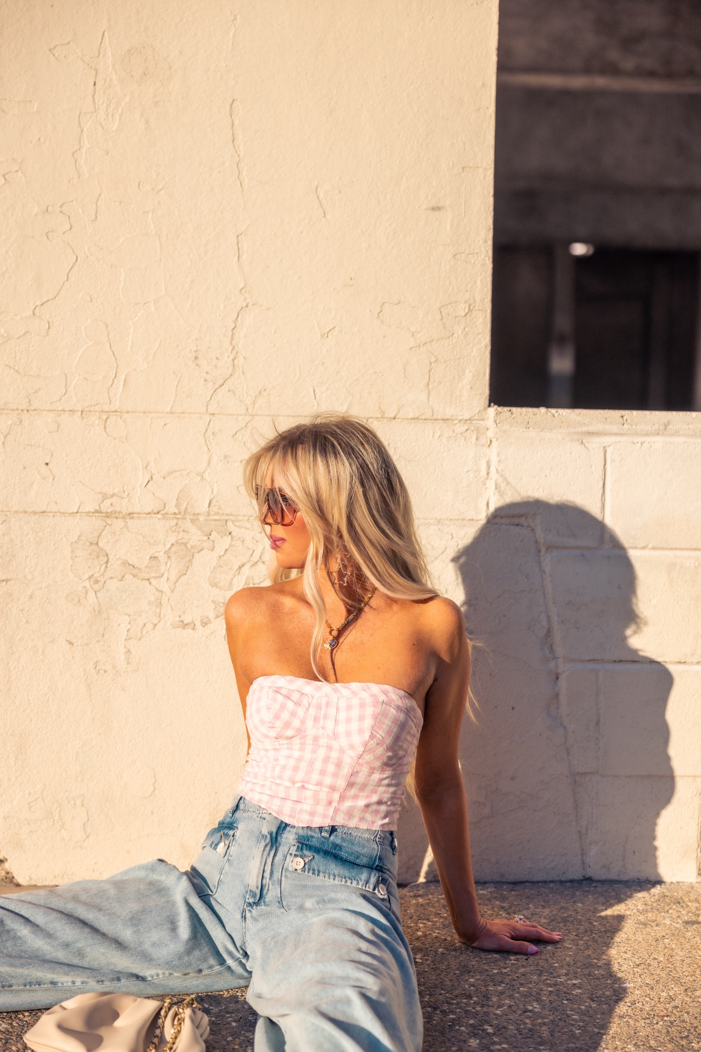 The outfit is a daring fusion of retro and modern style, with the high-waisted jeans offering a classic throwback appeal and the gingham tube top adding a playful, summery vibe. The light color palette is perfect for a warm day, and the relaxed fit of the jeans paired with the structured top strikes a chic, effortless balance.