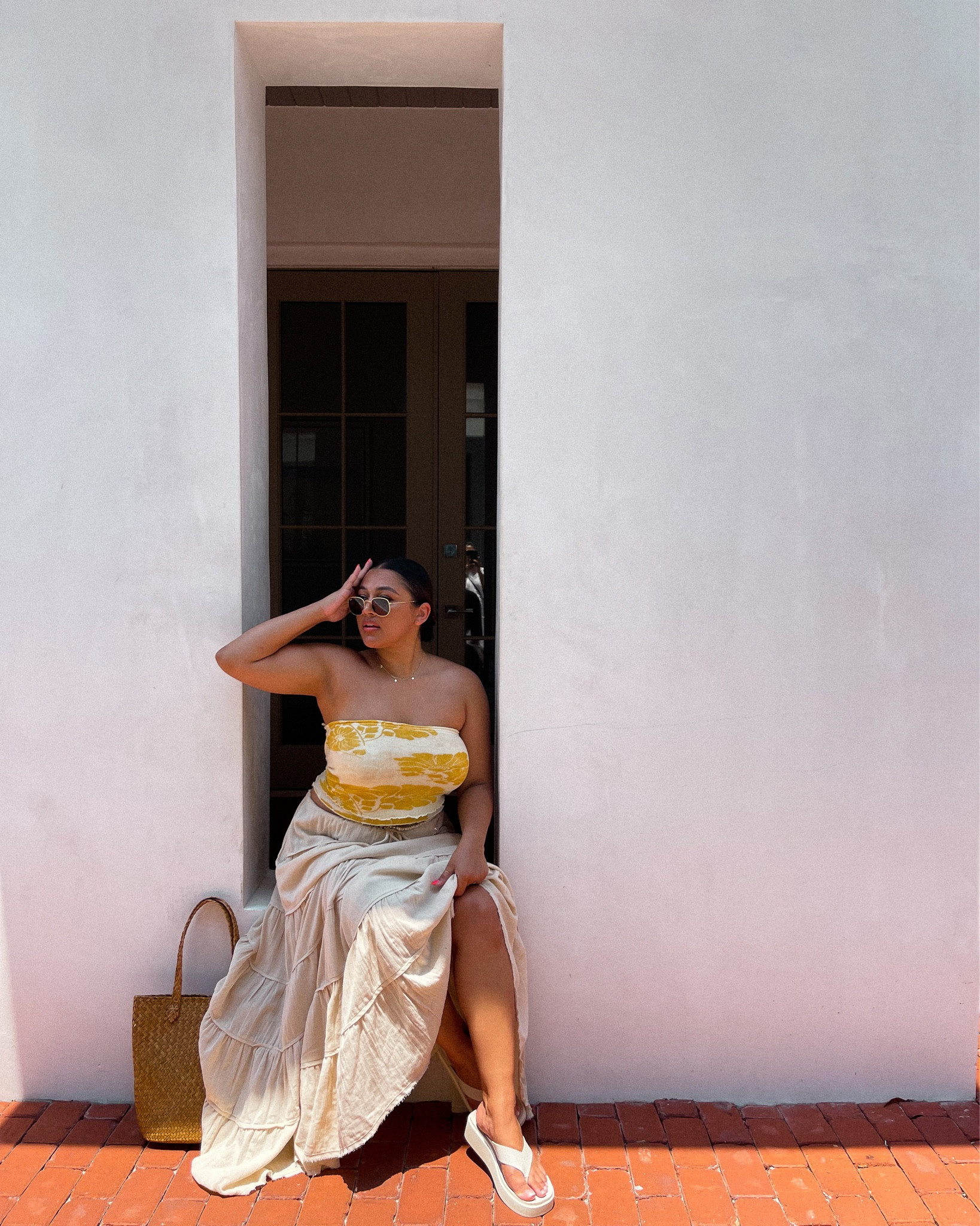 The high-waisted light blue trousers paired with the white strapless top create a fresh and effortless summer look, while the complementary beige accessories add a sophisticated touch. The relaxed silhouette balances comfort with chic style, perfect for a casual day out.
