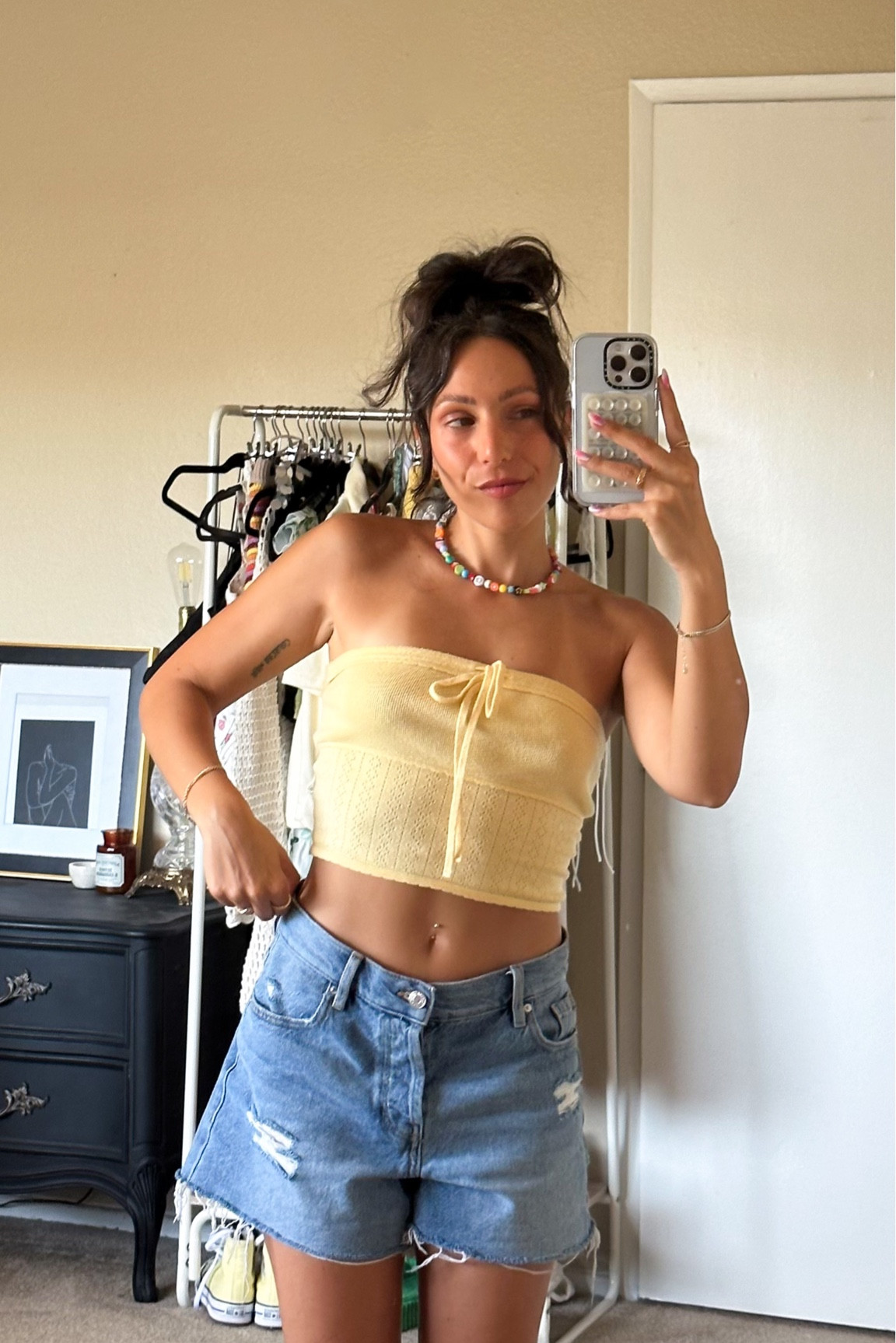 The ensemble exudes a breezy, summer vibe with the combination of a cropped, light-hued bandeau top and high-waisted denim shorts creating a balanced silhouette. The outfit is playfully accessorized with colorful beaded jewelry that adds a pop of personality and complements the relaxed, yet stylish aesthetic.