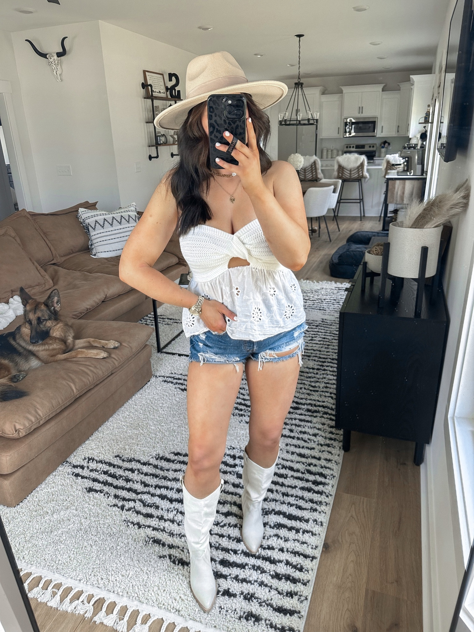 The outfit presents a harmonious blend of boho-chic and western elements, with the white, off-shoulder top offering a feminine charm complemented by the edgy denim shorts. The ensemble is seamlessly pulled together with the matching white cowboy boots and hat, creating a stylish and cohesive summer look.