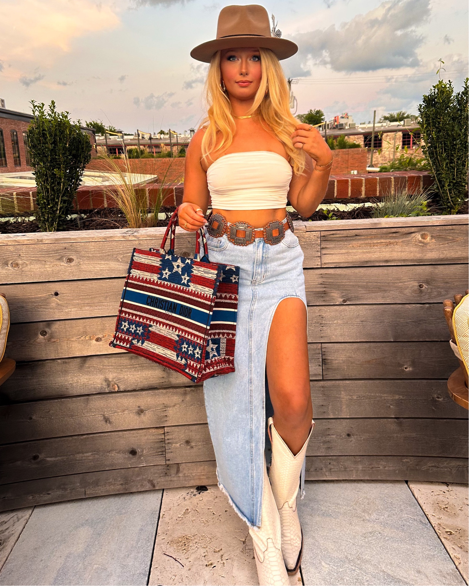 The ensemble pairs a classic high-slit denim skirt with a crisp white top, creating a refreshing balance of simplicity and trendiness. Accessorized with a statement belt, patterned tote, and cowboy boots, it masterfully blends bohemian flair with a touch of Americana style.