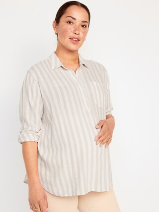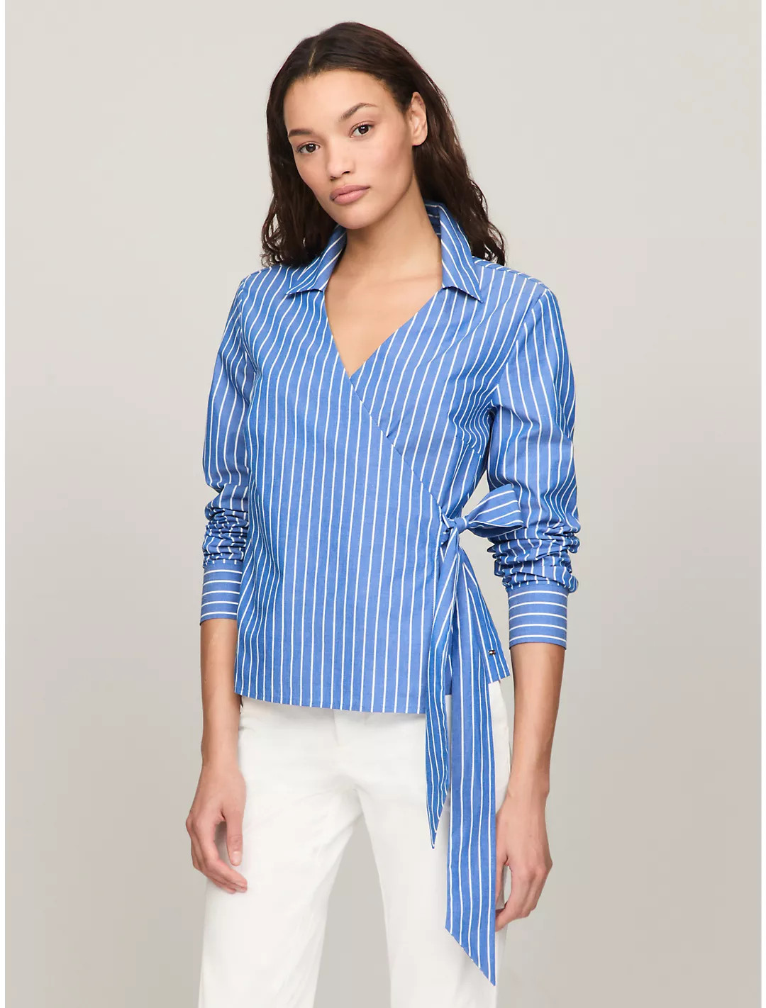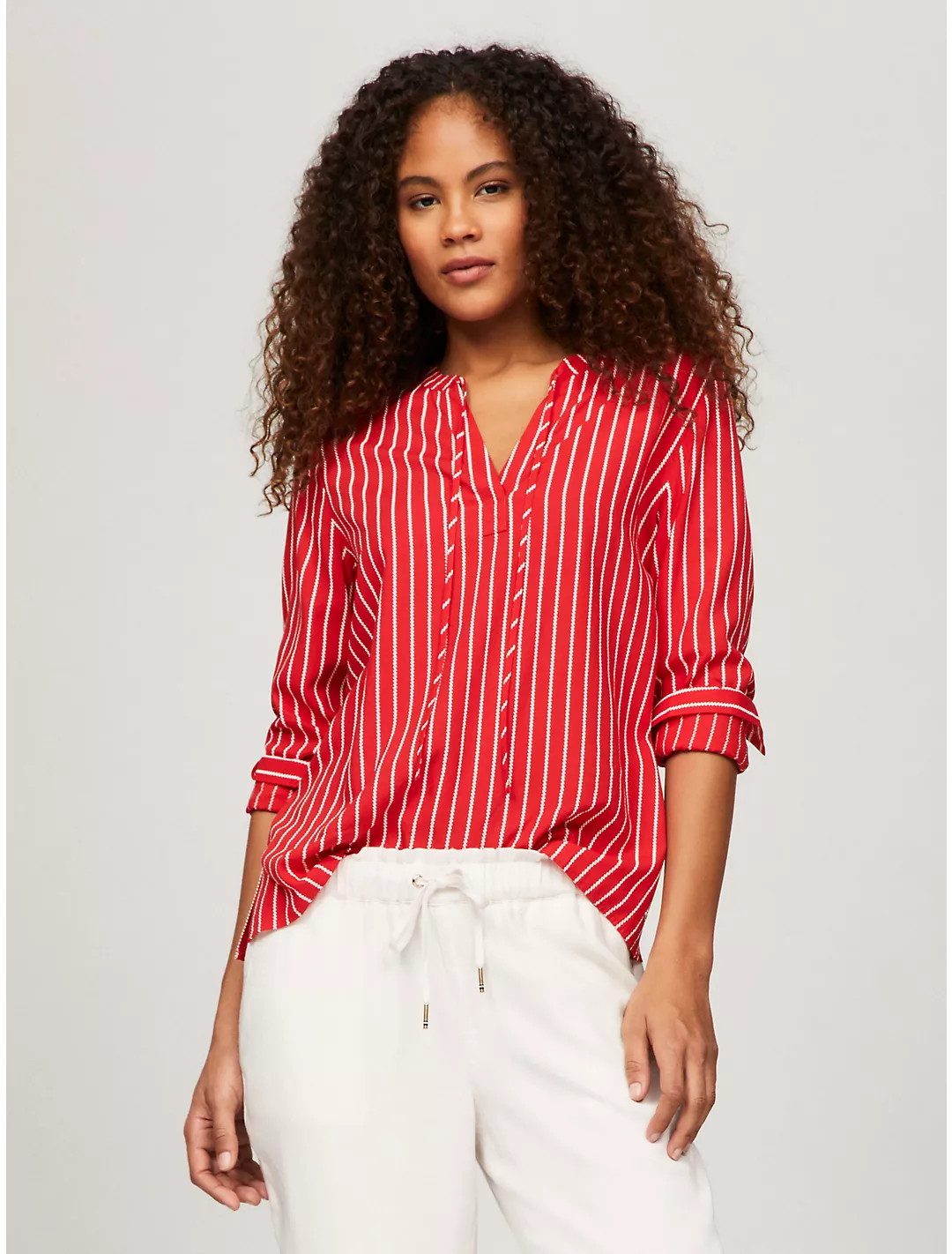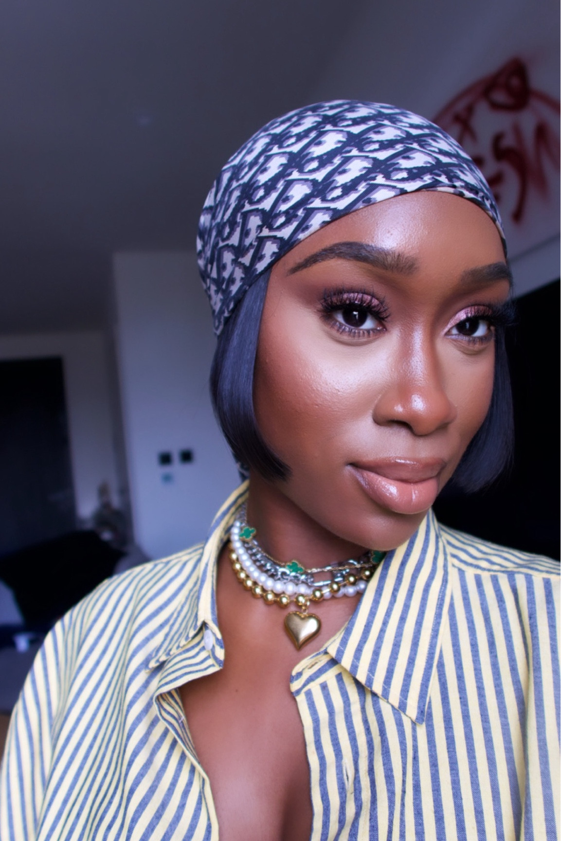 I love the way the patterned headscarf adds a bold touch, perfectly complementing the striped shirt for a chic and modern look. The layered necklaces bring an elegant and personalized flair, enhancing the overall outfit beautifully.