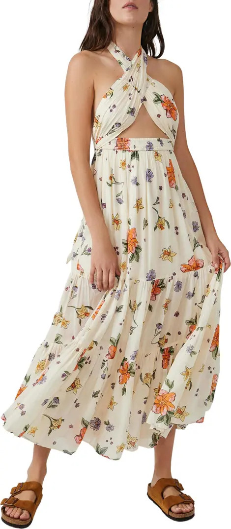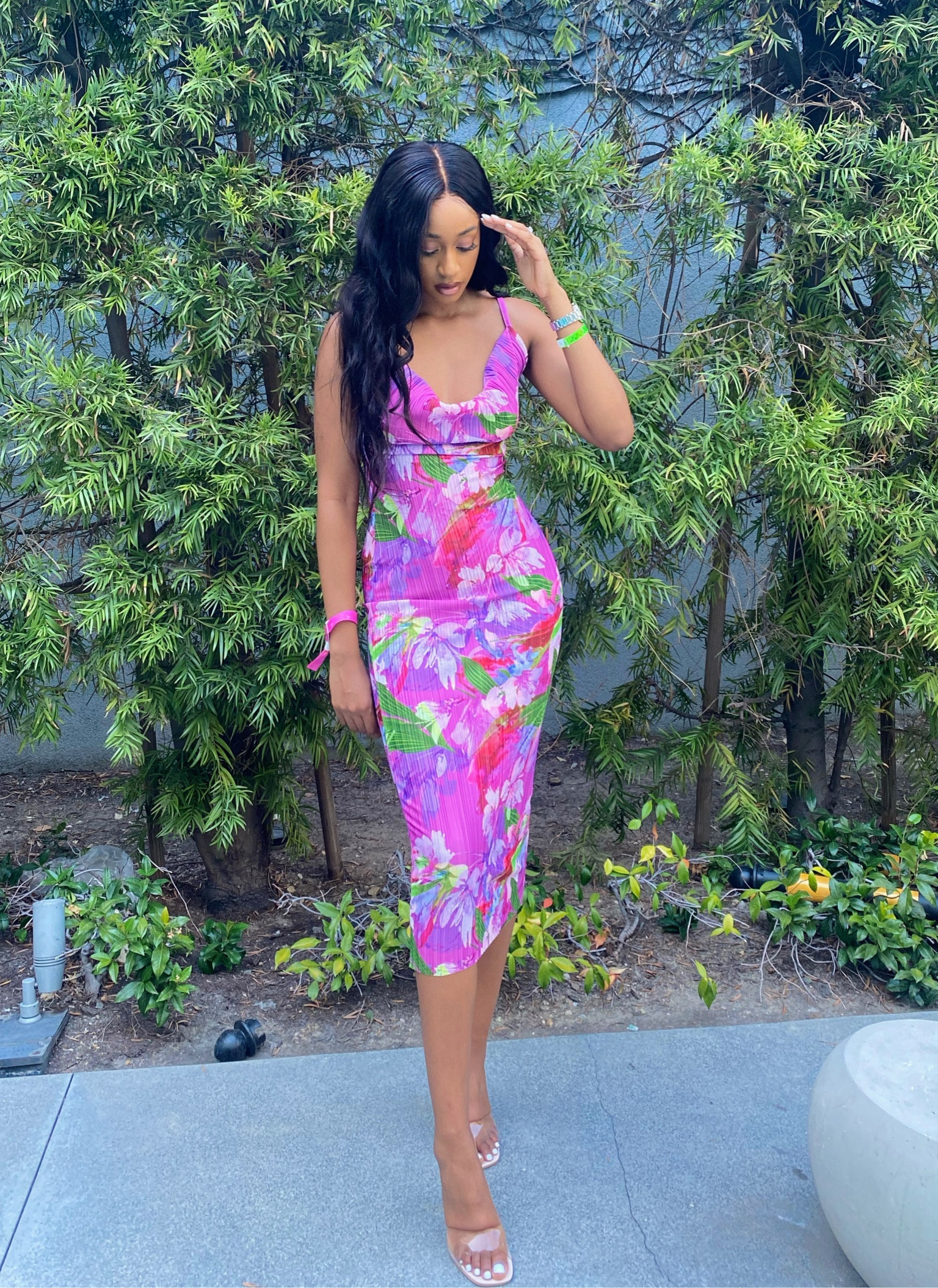 I love how the floral pattern on the dress beautifully complements the natural greenery, creating a vibrant, fresh look. The fitted silhouette pairs perfectly with the clear heels for an elegant and modern touch.
