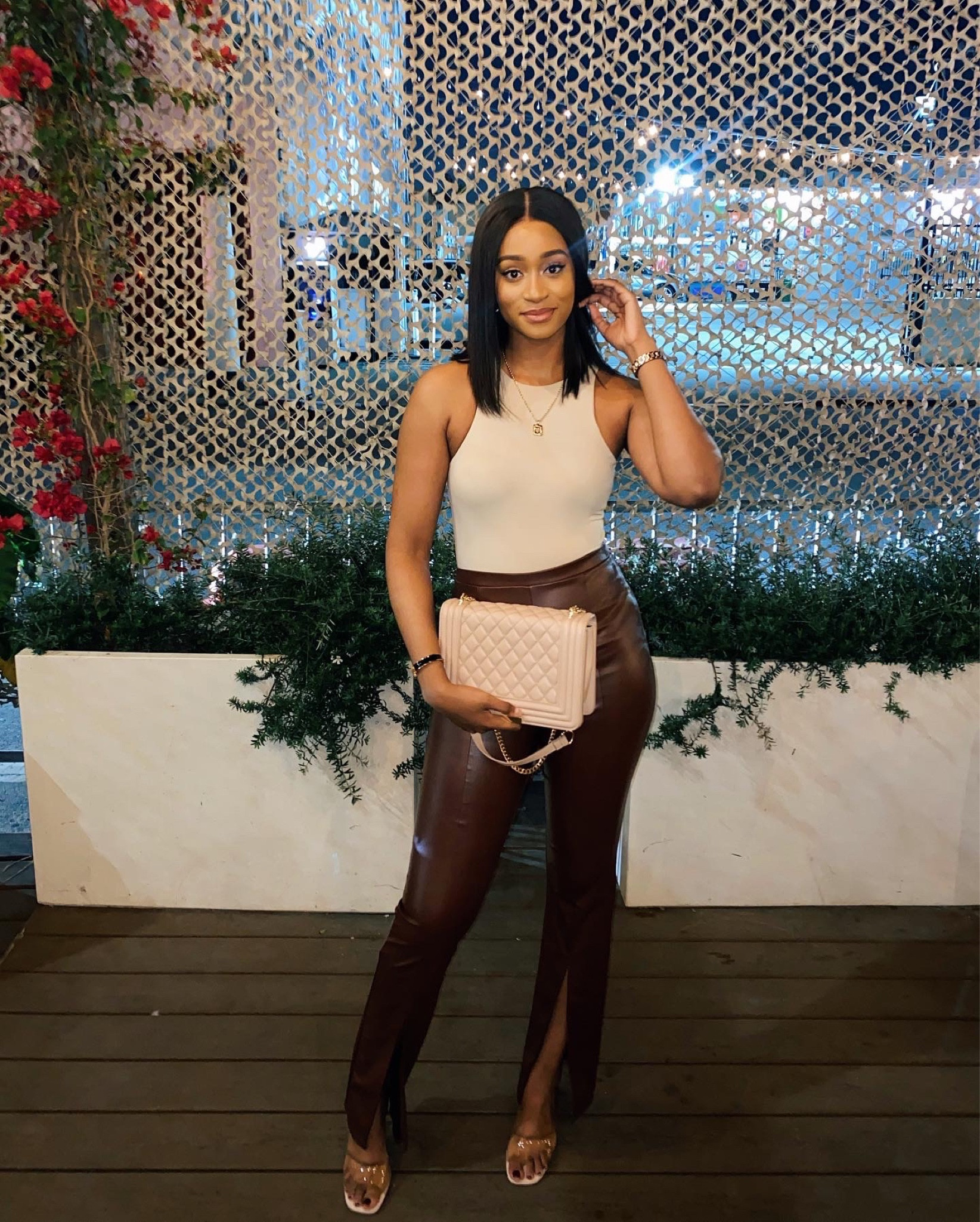I love this outfit because the sleek, high-waisted leather pants add a chic and edgy vibe, perfectly balanced by the simplicity of the fitted beige top. The quilted purse and delicate jewelry bring a touch of elegance, making the ensemble effortlessly stylish.