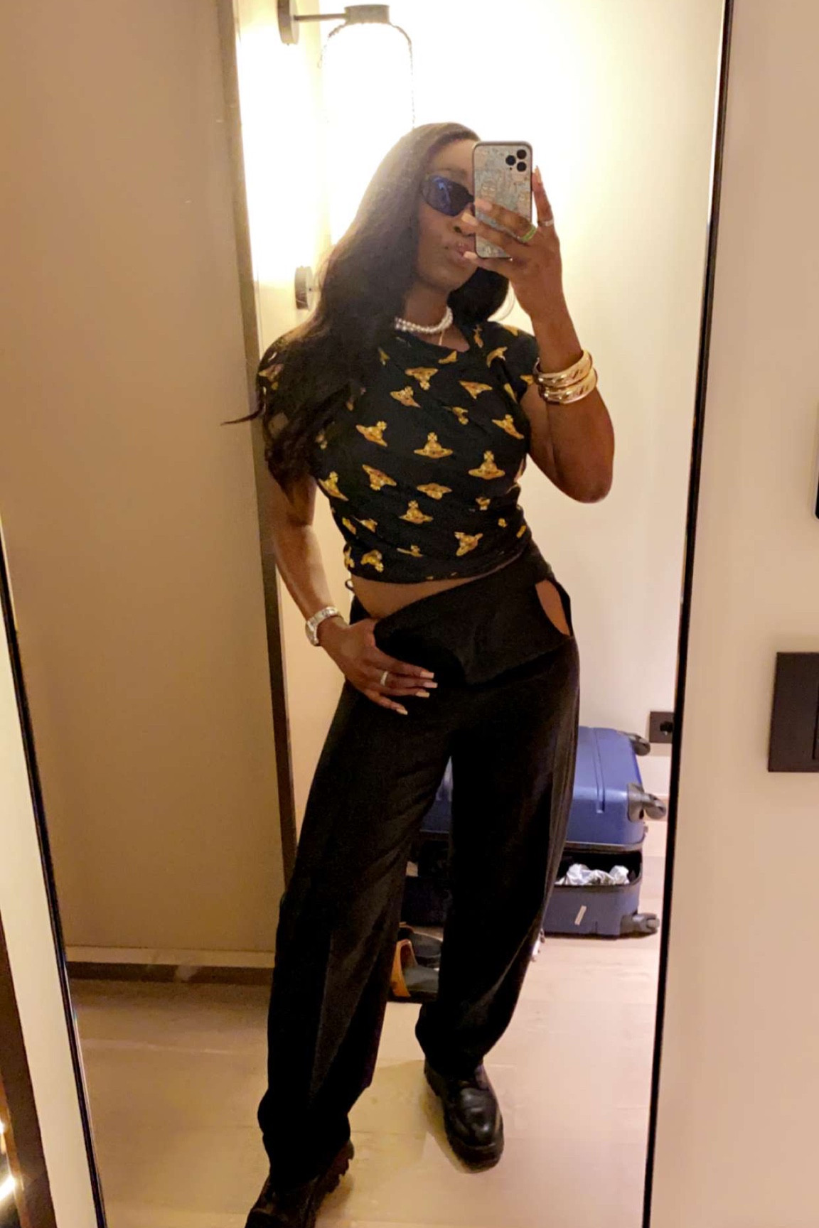 I love how the bold patterned top adds a playful contrast to the sleek, edgy black pants, creating a dynamic balance. The oversized sunglasses and chunky jewelry elevate the look with a touch of glamour and modern flair.