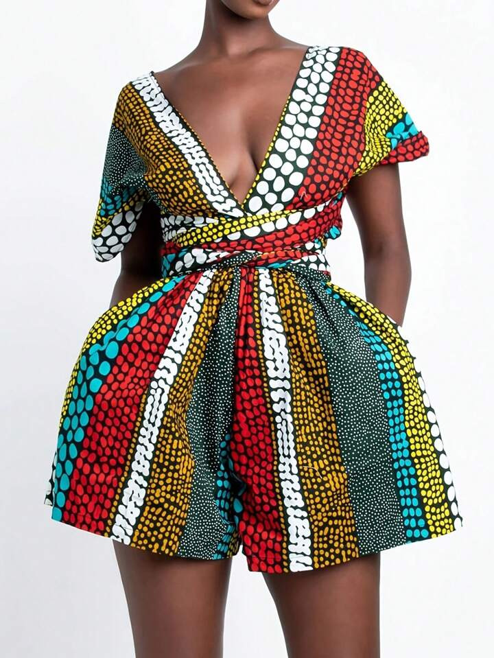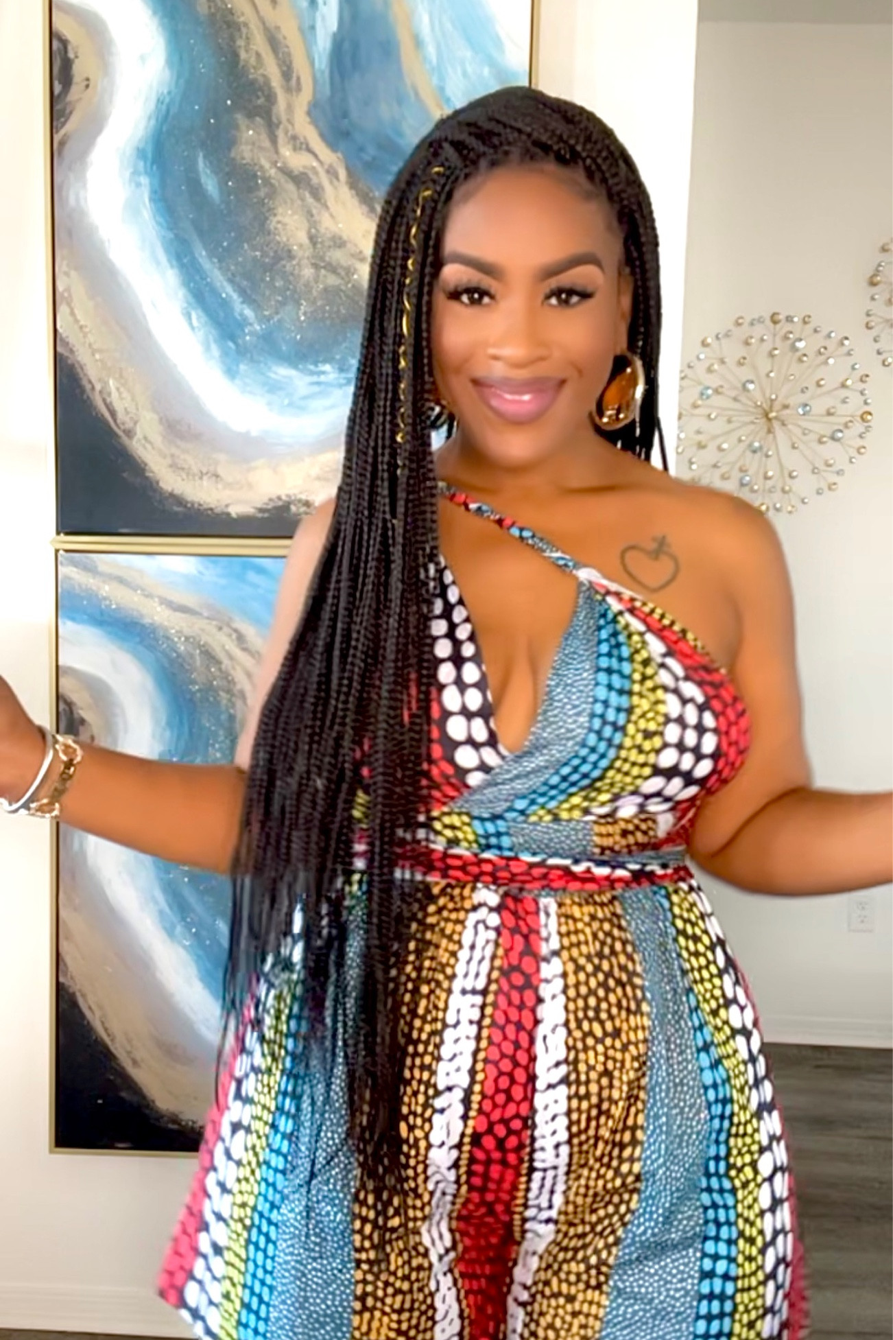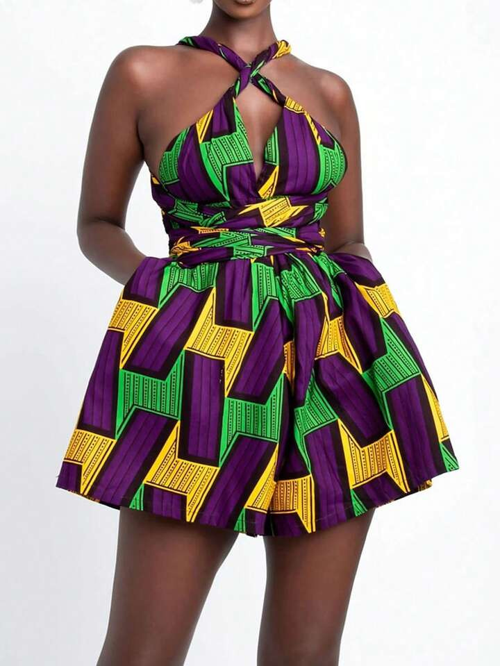 I love the vibrant print, which beautifully combines an array of colors for a lively and eye-catching effect. The asymmetrical design adds a unique twist, highlighting the wearer’s confidence and style.