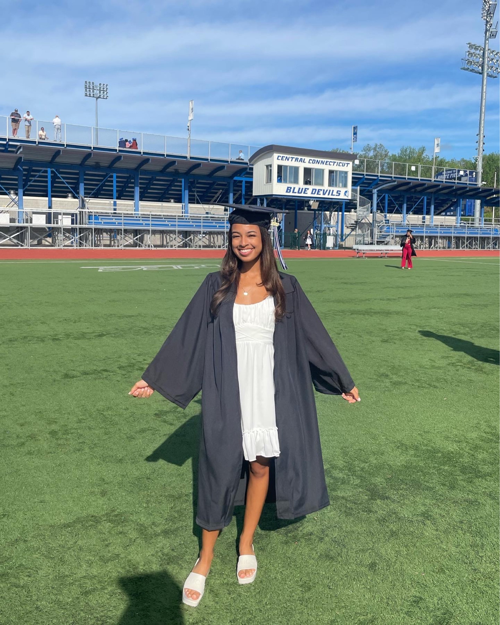 The outfit cleverly blends a classic graduation gown with a chic white dress, offering a crisp and refreshing look. The sandals add a touch of comfort and modern style, perfectly balancing elegance and ease.