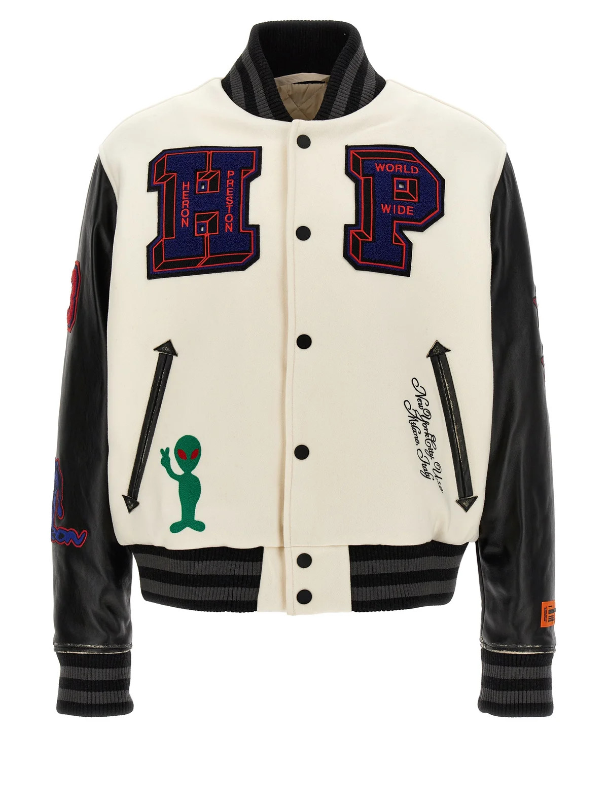I love how this varsity jacket adds a bold, sporty flair to the classic black and white ensemble. The textured patches provide a playful touch, making the outfit both chic and edgy.