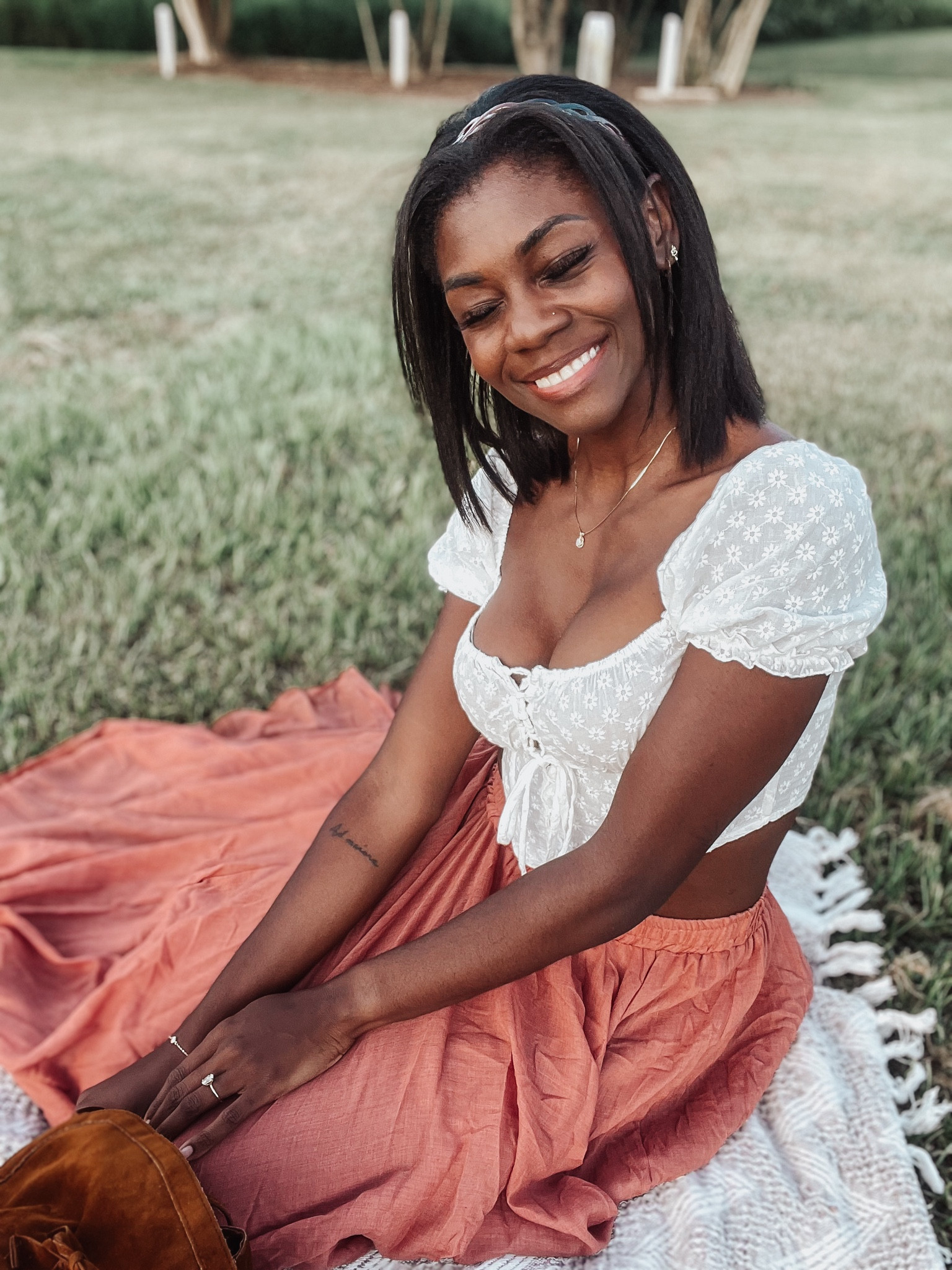 I love how the white eyelet crop top adds a touch of elegance, perfectly complementing the earthy tones of the flowing rust-colored skirt. The combination creates a balanced and effortlessly chic look for a relaxed day outdoors.