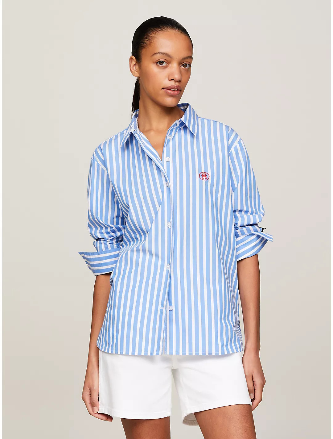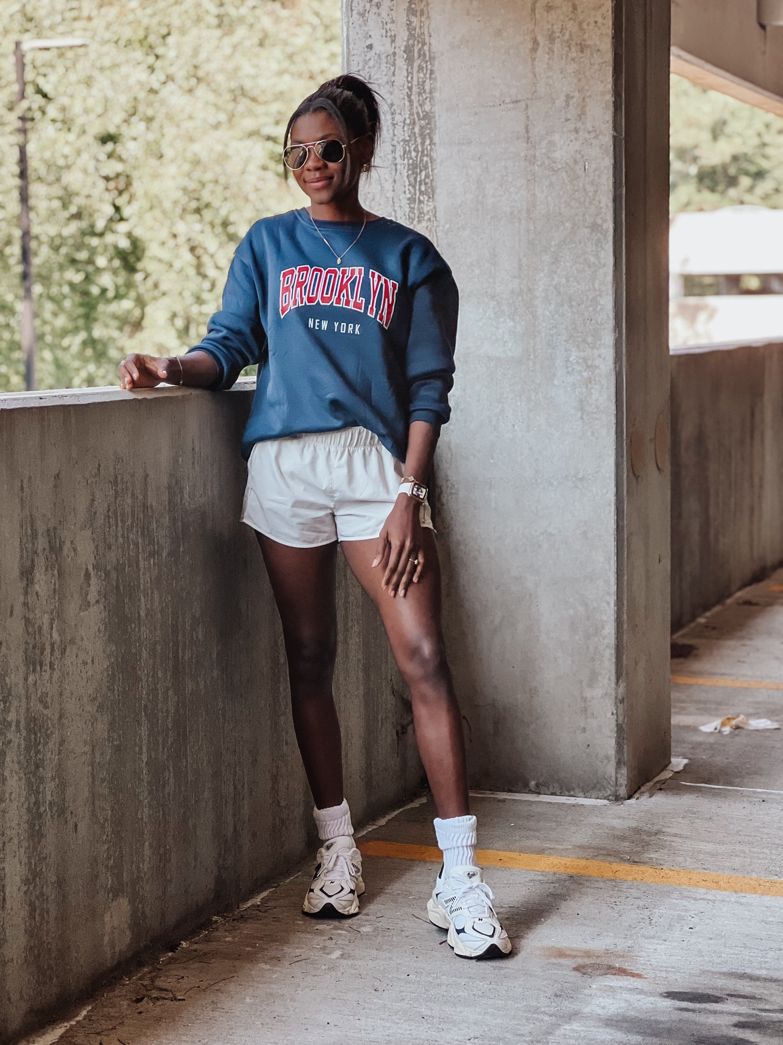 This outfit expertly combines sporty and casual elements with its cozy sweatshirt, giving off a relaxed yet stylish vibe. The white shorts and sneakers create a fresh, clean look that’s perfect for a laid-back day.