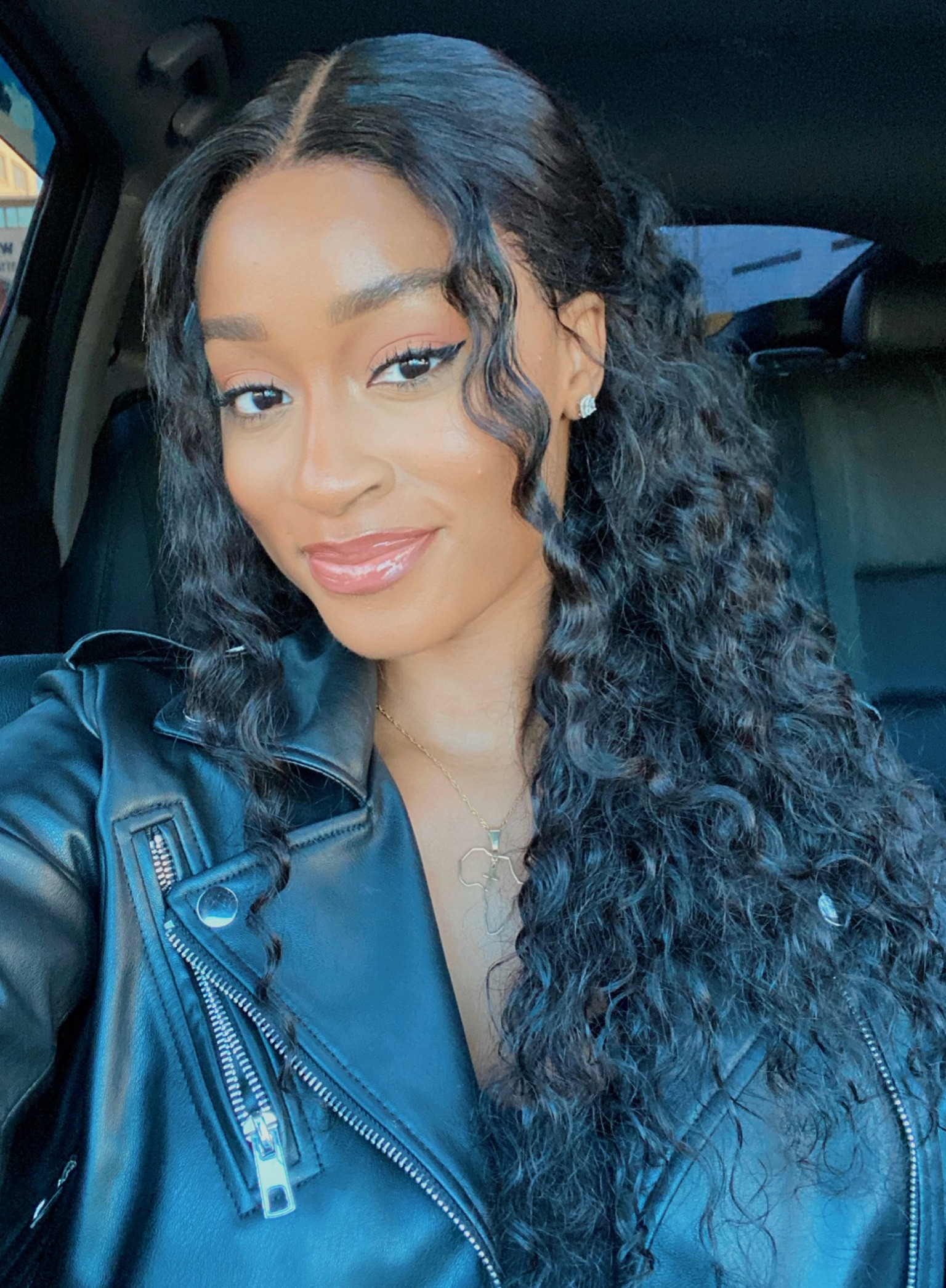 I love how the leather jacket adds an edgy touch to the look, perfectly complementing the soft curls and highlighting a chic balance. The minimal makeup and delicate jewelry create a polished finish that’s effortlessly stylish.