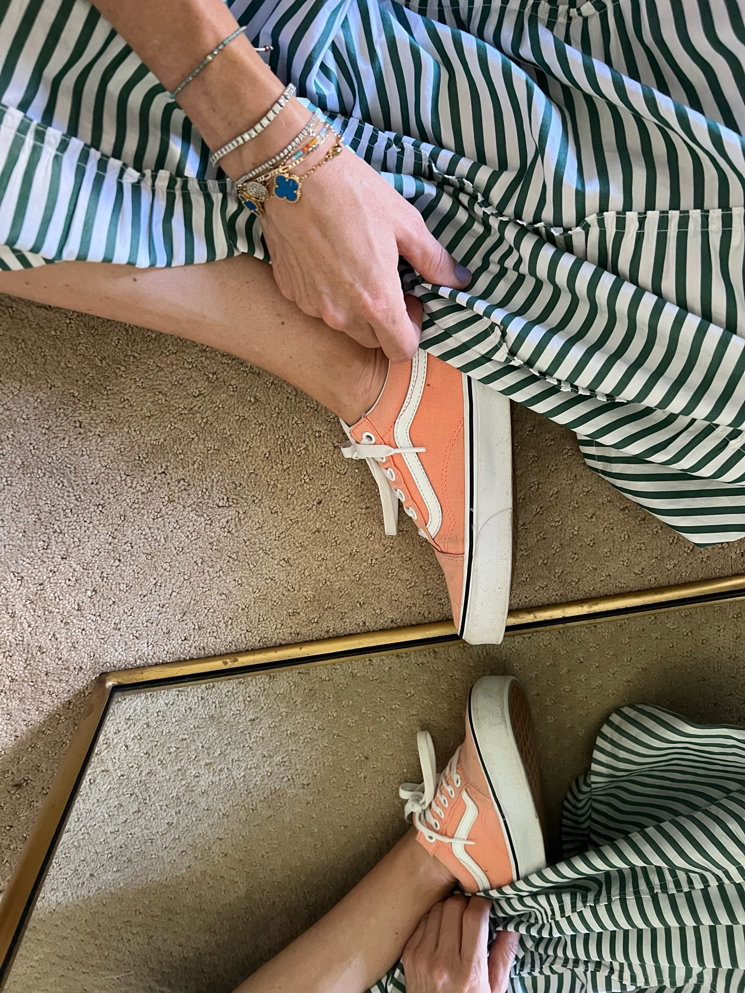 I love how the casual vibe of the peach sneakers perfectly complements the playful, flowing striped skirt. The addition of delicate bracelets adds a touch of personal charm to the ensemble.
