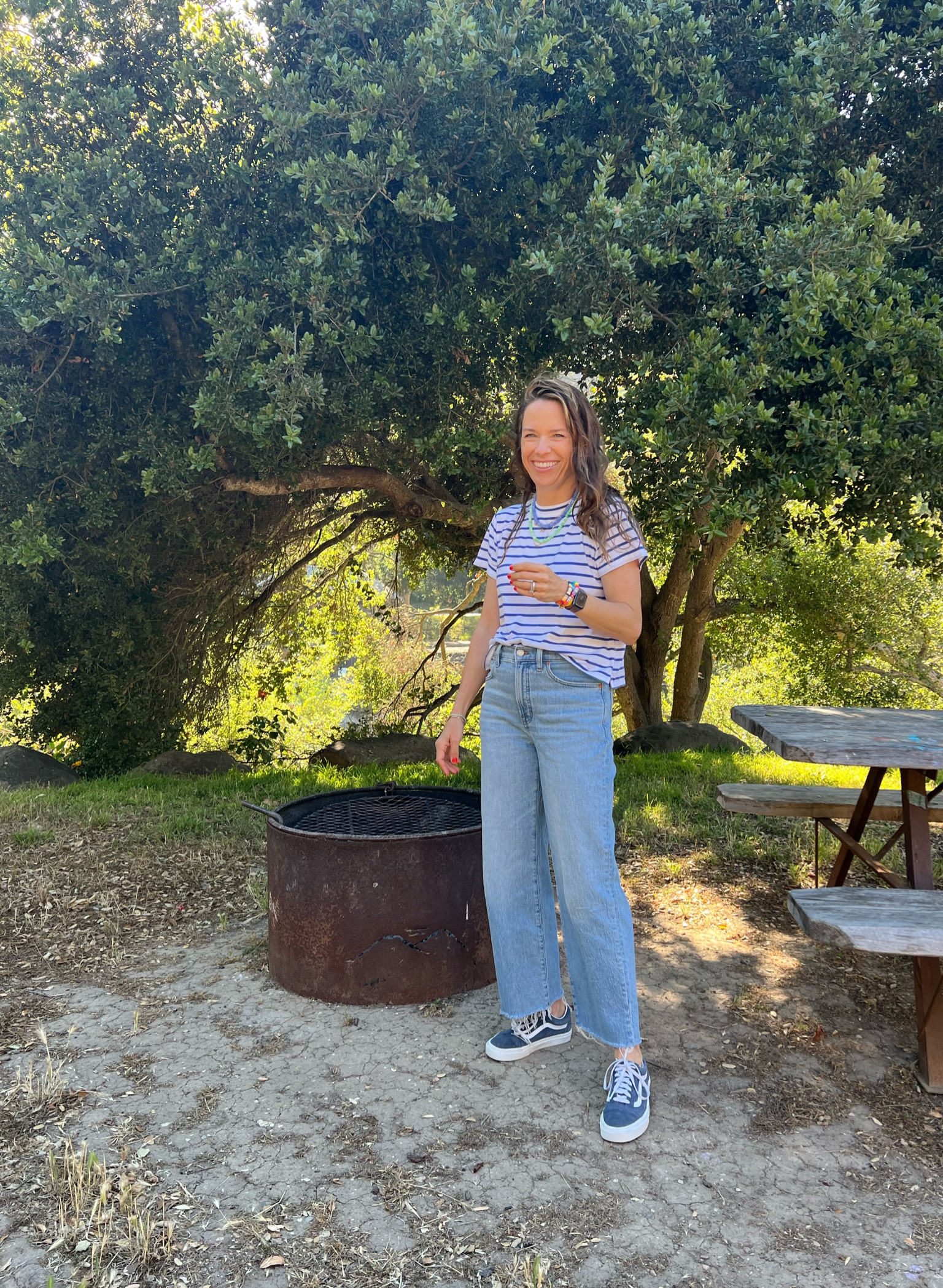 I love how this outfit captures a relaxed, casual vibe with the striped tee and high-waisted jeans, perfect for an outdoor setting. The sneakers add a laid-back touch, making the look both practical and stylish.