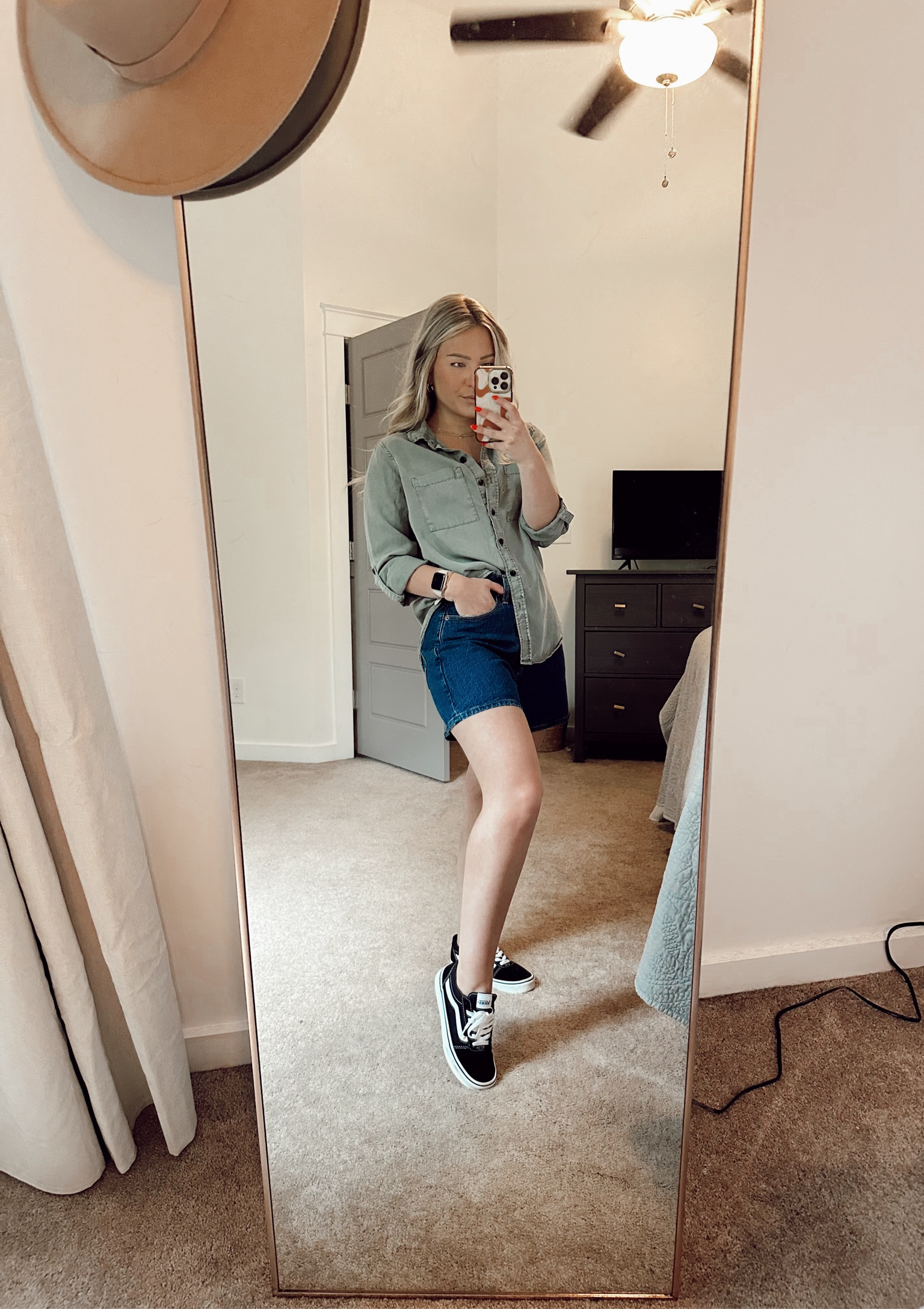 I love this outfit because the denim shirt paired with shorts creates a casual yet stylish look, and the sneakers add a trendy, comfortable touch perfect for everyday wear. The neutral tones and cohesive accessories make it effortlessly chic.