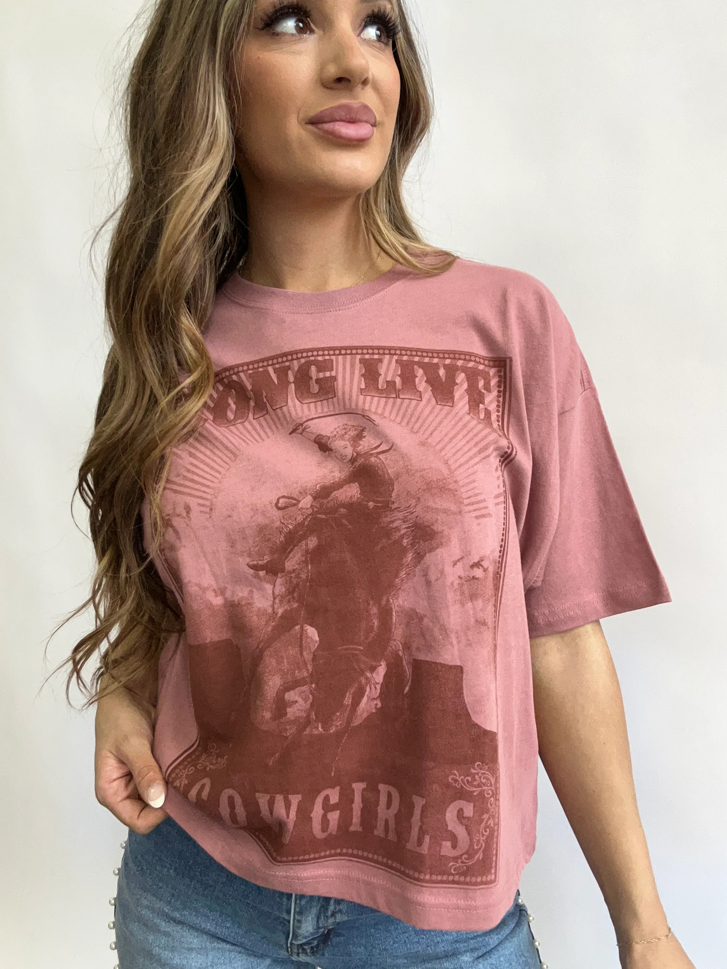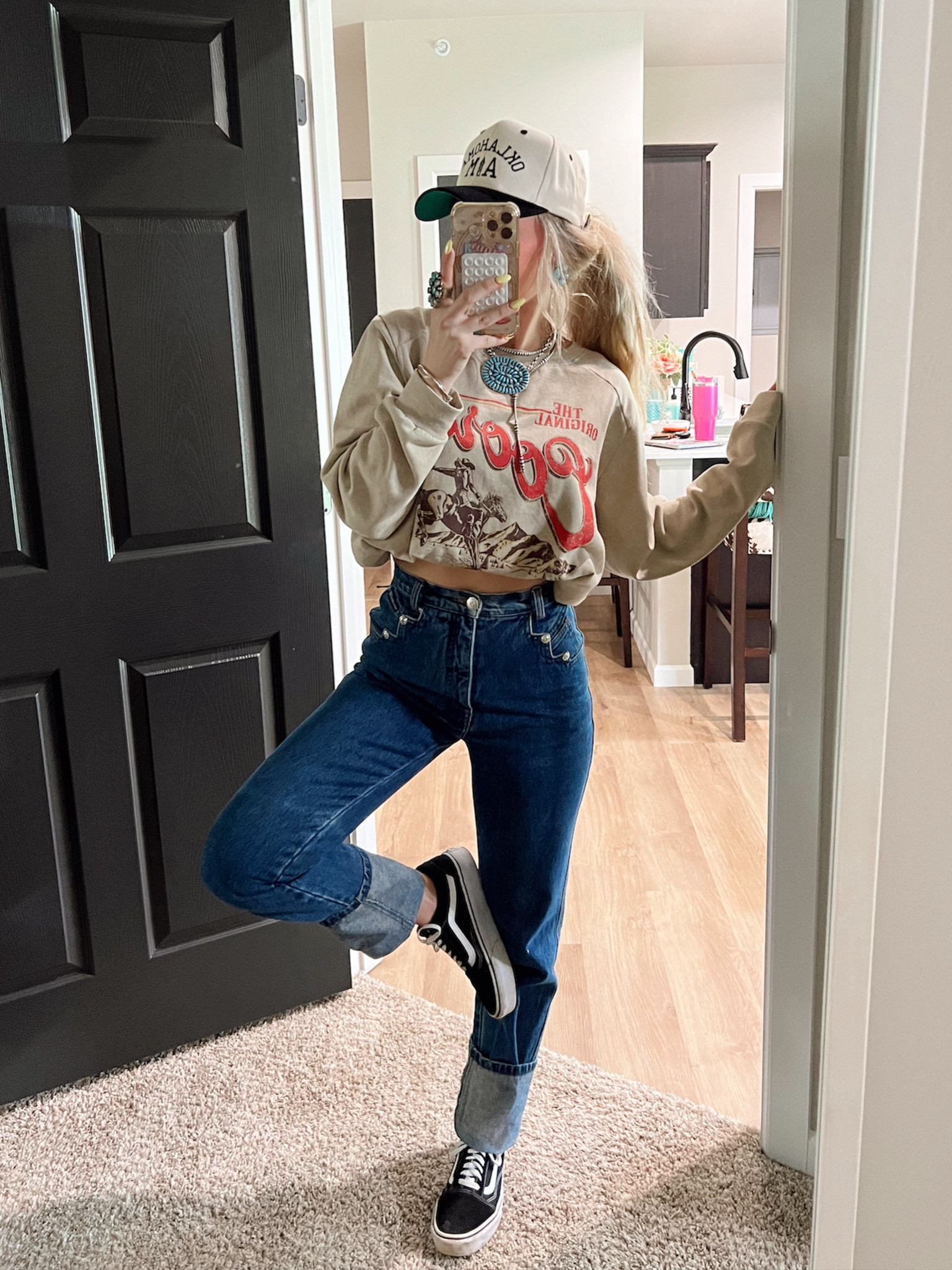 I love how this outfit perfectly balances casual and trendy, with the graphic crop top adding a touch of retro flair while the high-waisted jeans and sneakers keep it effortlessly cool. The baseball cap and relaxed hairstyle tie the look together, making it perfect for a laid-back day out.