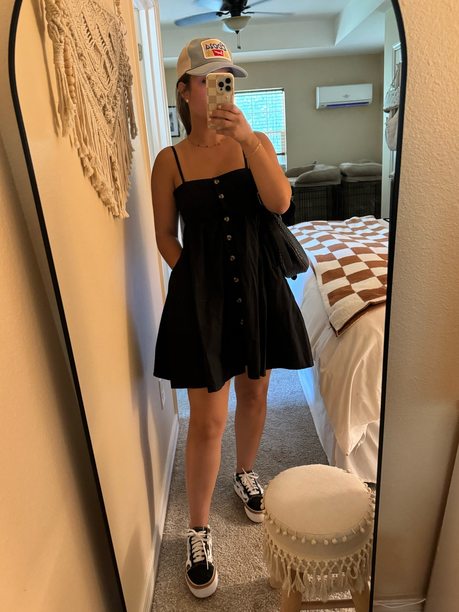 I love how the black dress offers a classic yet chic silhouette, making it versatile for any occasion. The casual hat and sneakers addition perfectly balance comfort and style, giving it a laid-back vibe.