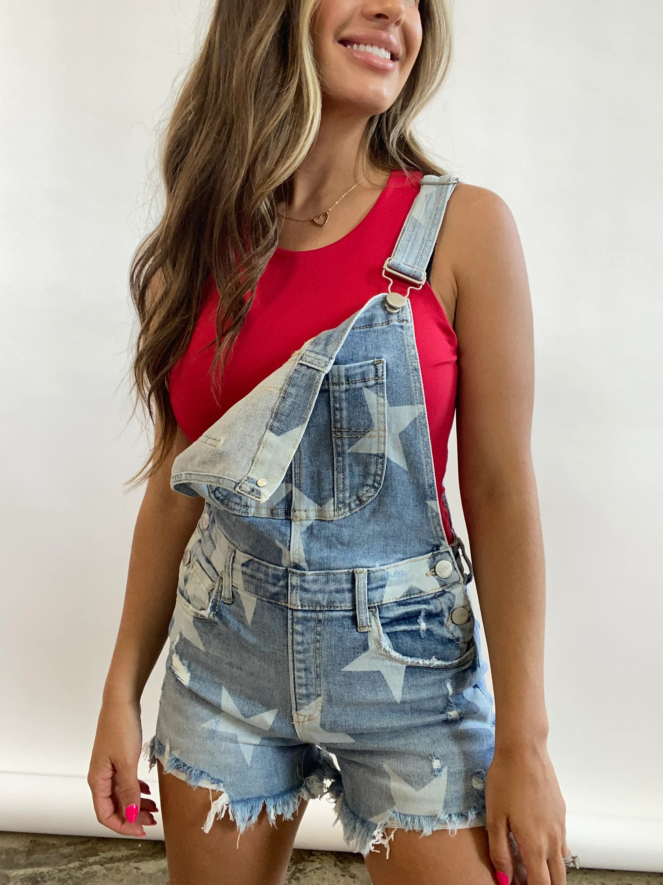 I love how the distressed denim overalls give a casual yet trendy vibe, and pairing them with a bright red tank top adds a bold pop of color. The red sneakers not only match the tank perfectly but also add a playful and cohesive touch to the entire look.