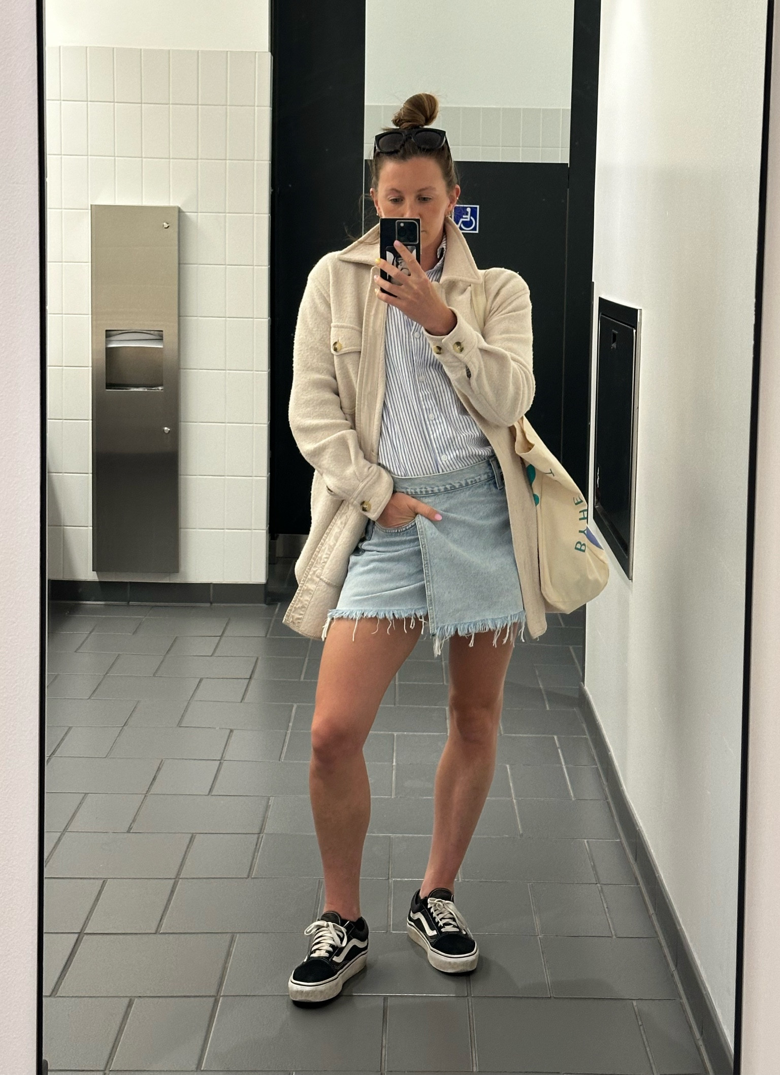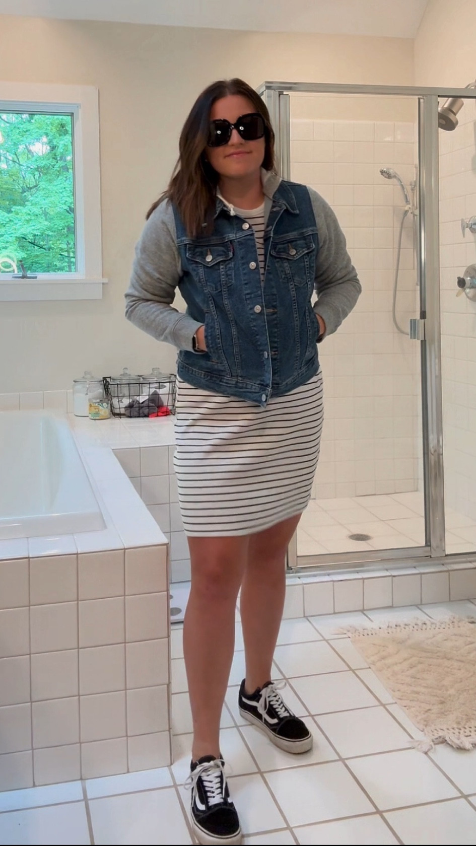 I love this outfit because the denim jacket adds a chic, casual layer to the striped dress, creating a balanced look that’s effortlessly stylish. The Vans sneakers complete the ensemble with a touch of urban cool and comfort.