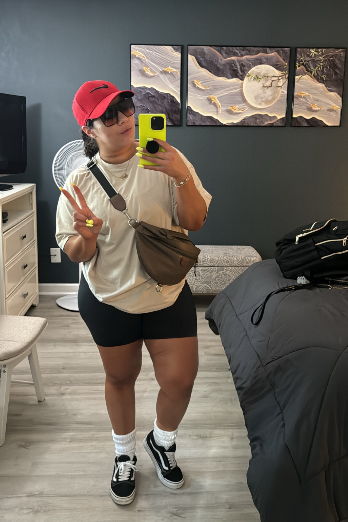 I love this outfit because it masterfully blends casual comfort with a trendy edge, thanks to the combination of the oversized camo tee and the fitted bike shorts. The high socks and classic sneakers add a touch of sporty flair while maintaining a laid-back vibe.