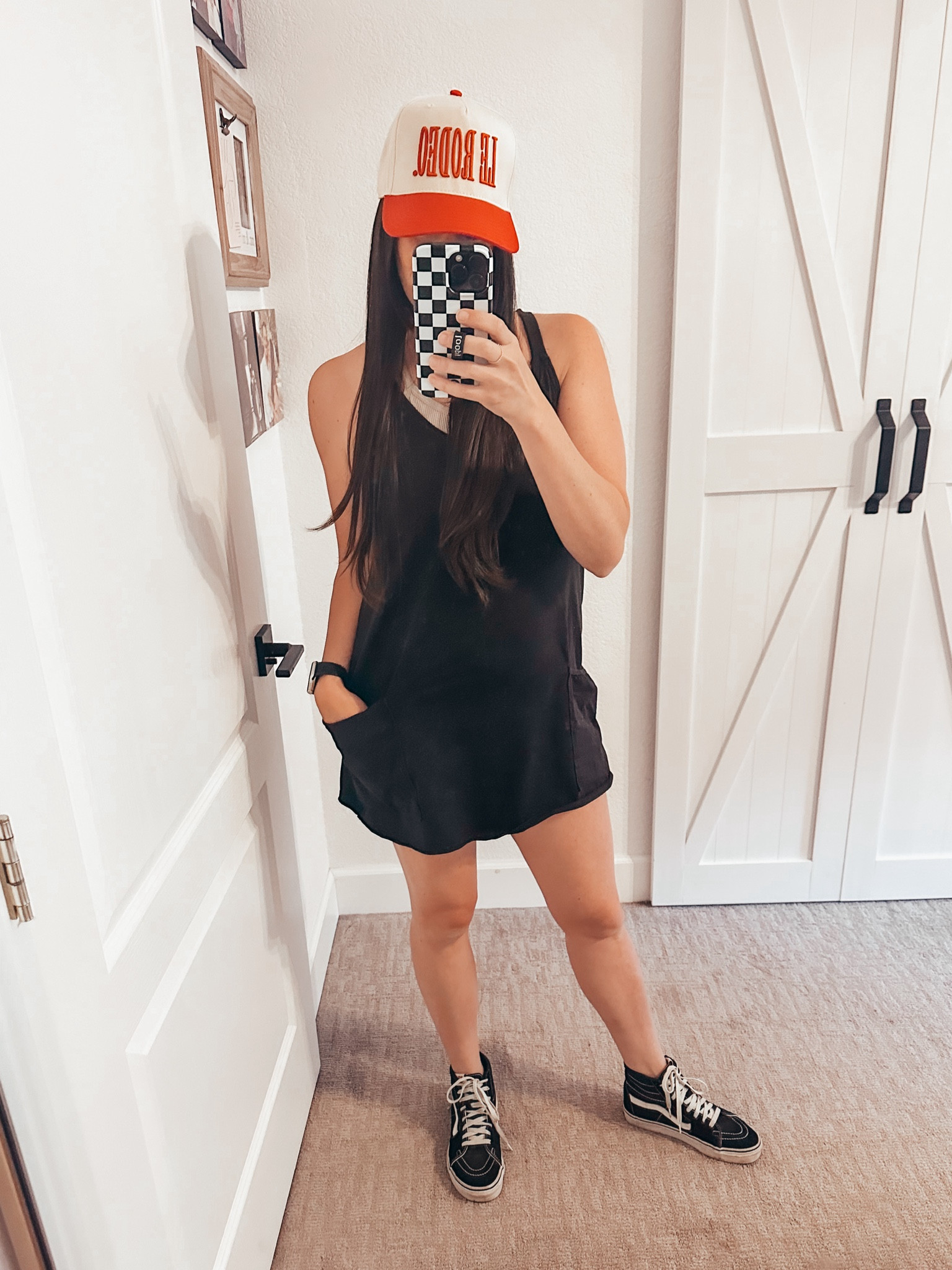 I love how the sleek black romper creates a chic and versatile look, while the casual hat and sneakers add a fun, laid-back vibe. The outfit strikes a perfect balance between style and comfort for any casual outing.