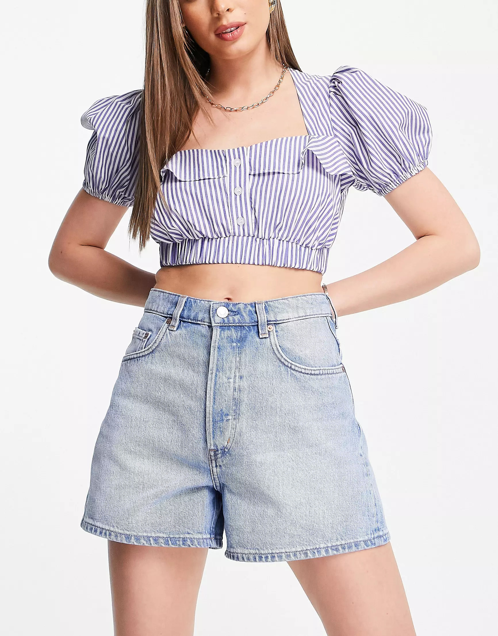 I love how the minimalist white tube top pairs effortlessly with the high-waisted denim shorts, creating a chic, casual vibe. The black sneakers and crossbody bag add practical yet stylish elements, making this outfit perfect for a laid-back day out.