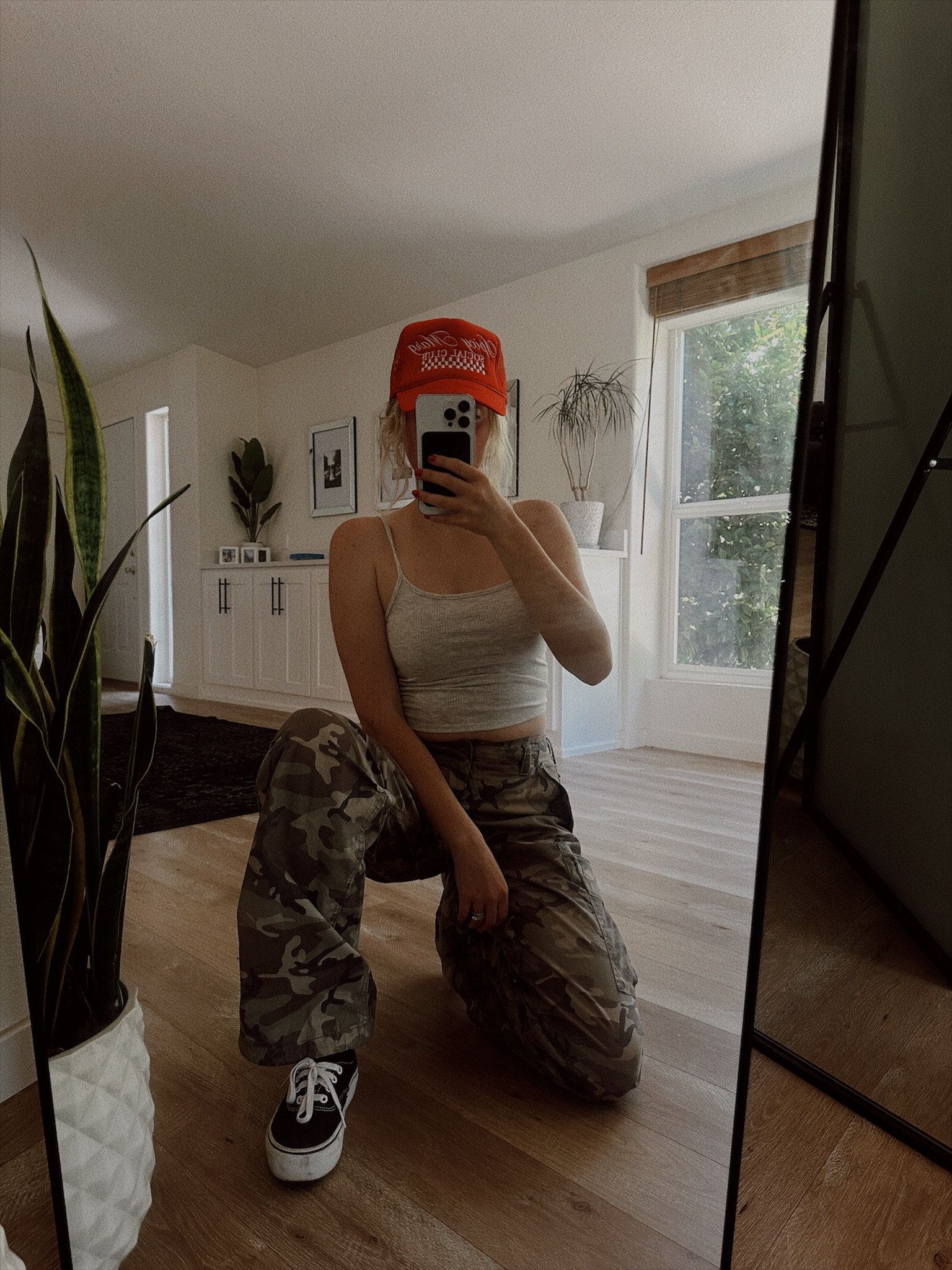 I love how this look balances a casual tank top with edgy camo pants, creating a chic yet relaxed vibe. The bright orange cap adds a fun pop of color, making the outfit stand out effortlessly.