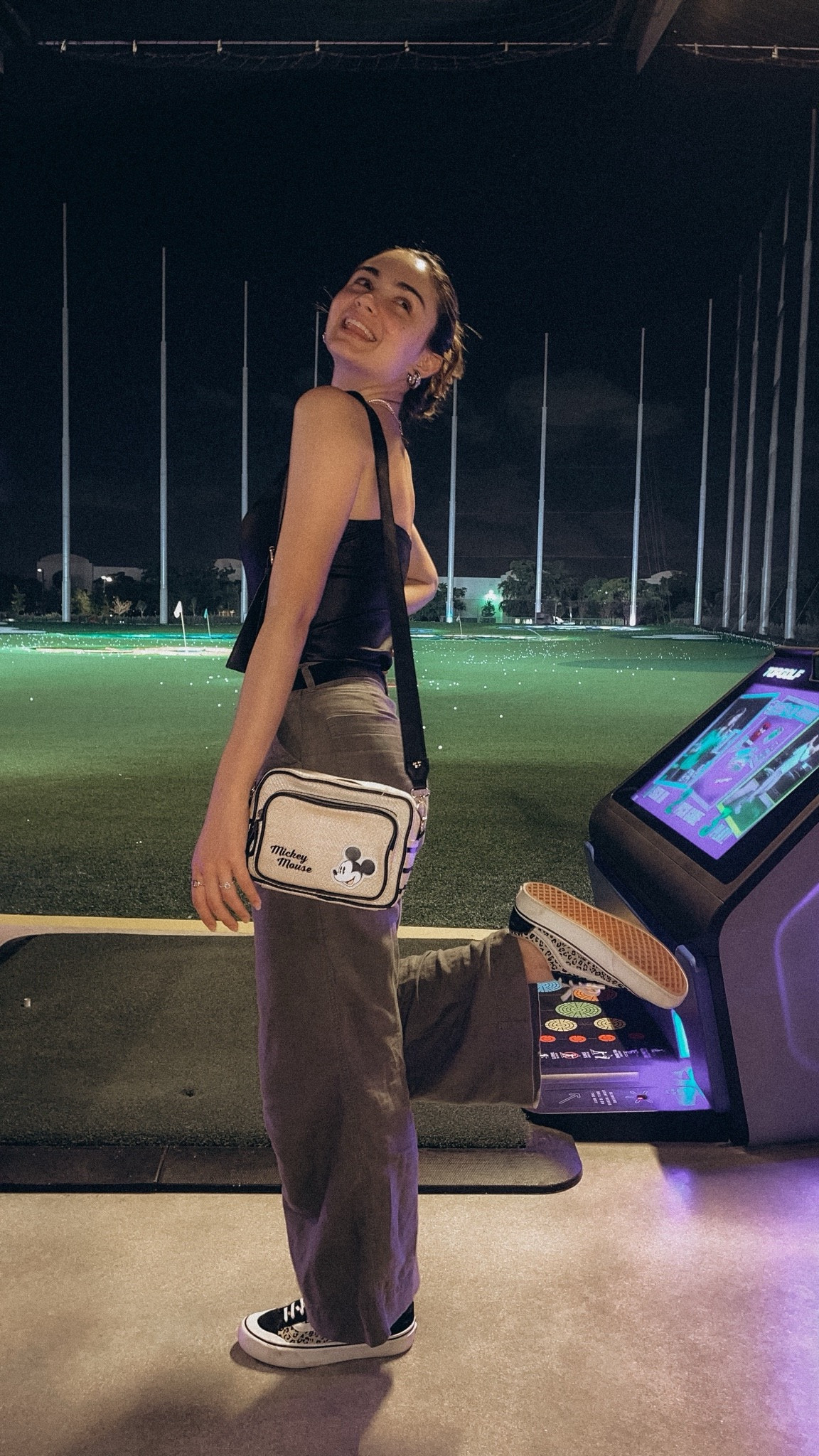 I love how this outfit balances casual and chic with the sleek, black top paired with wide-leg khaki pants. The playful Disney-themed crossbody bag adds a fun twist, making it perfect for a laid-back yet stylish look.