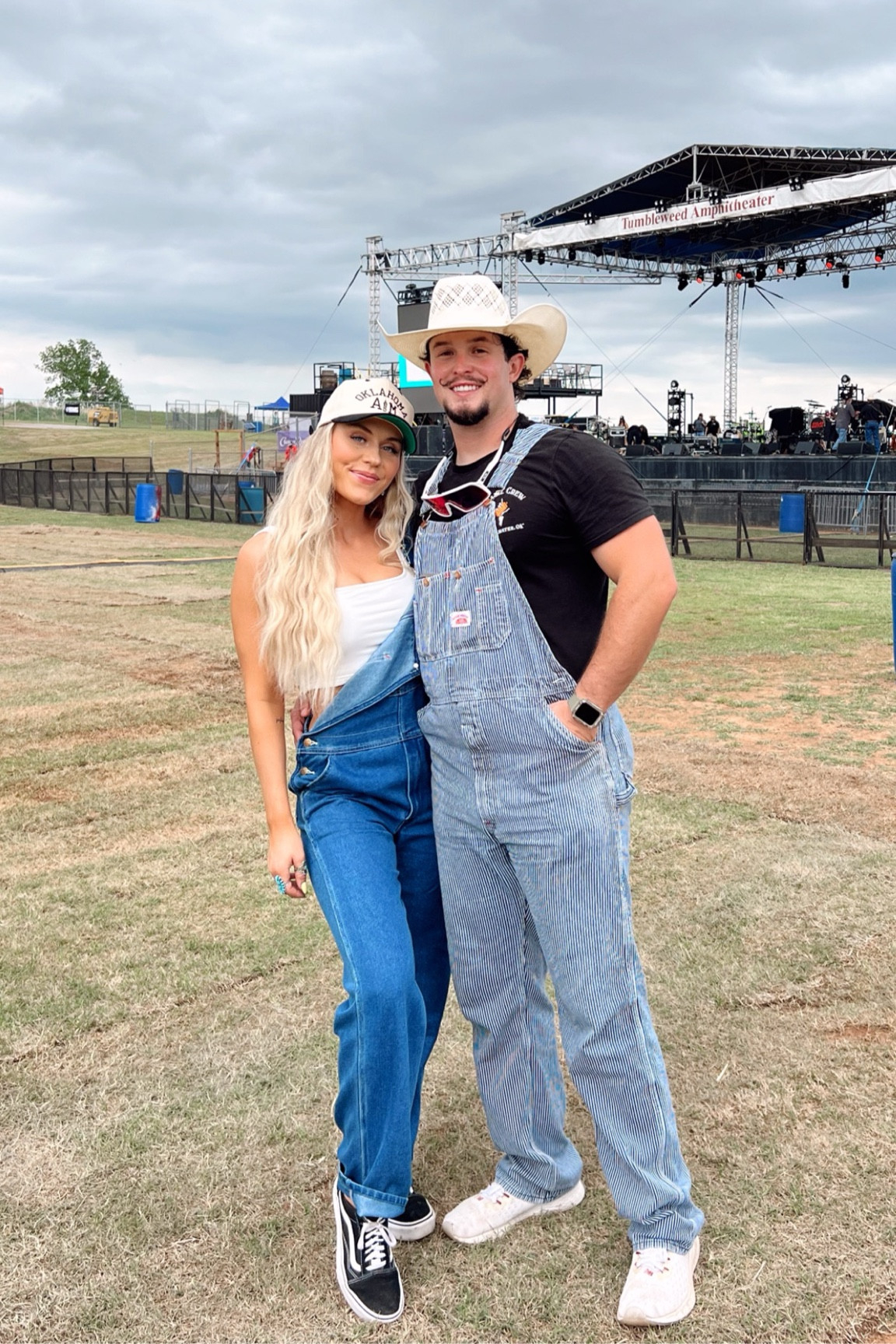 I love this outfit because it exudes a perfect blend of casual comfort and stylish fun, especially with the playful overalls and the coordinated country hats. The matching yet individualistic touches really make them stand out as a dynamic duo!