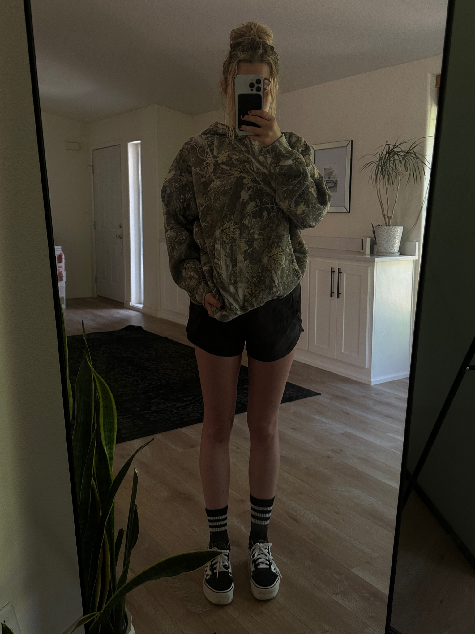 I love the casual yet stylish vibe of this outfit, combining a trendy oversized camo hoodie with classic black shorts. The striped socks and sneakers add a fun and laid-back touch, perfect for a relaxed day out.