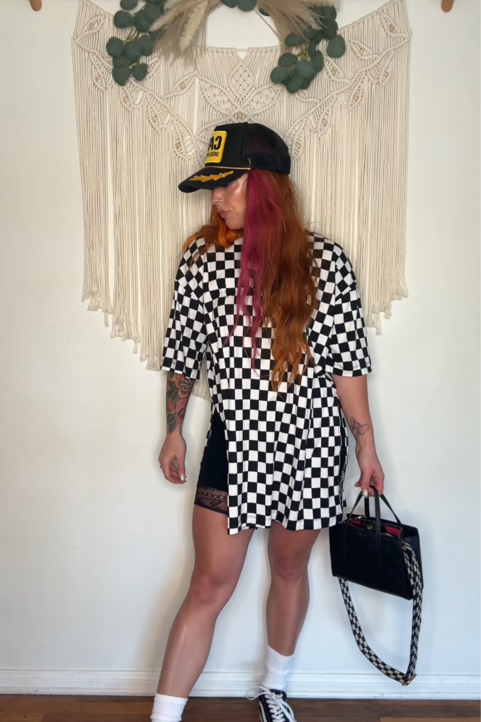I love how the oversized checkerboard shirt gives a bold and dynamic feel, perfectly complemented by the edgy baseball cap and classic sneakers for a chic, street style vibe. The lace detail on the shorts adds a subtle touch of femininity, balancing the overall look beautifully.