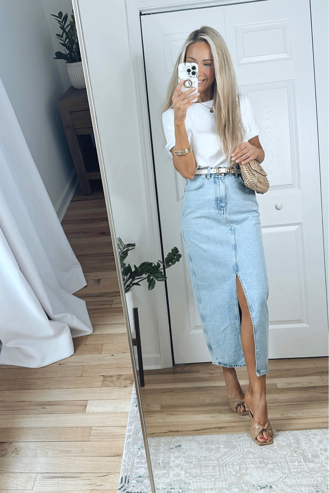 This ensemble exudes a chic simplicity with its classic white tee tucked into a high-waisted denim skirt, creating a clean and tailored silhouette. The side slit in the skirt adds a modern touch, while the strappy sandals and textured clutch perfectly accessorize the look for a balanced blend of casual sophistication.