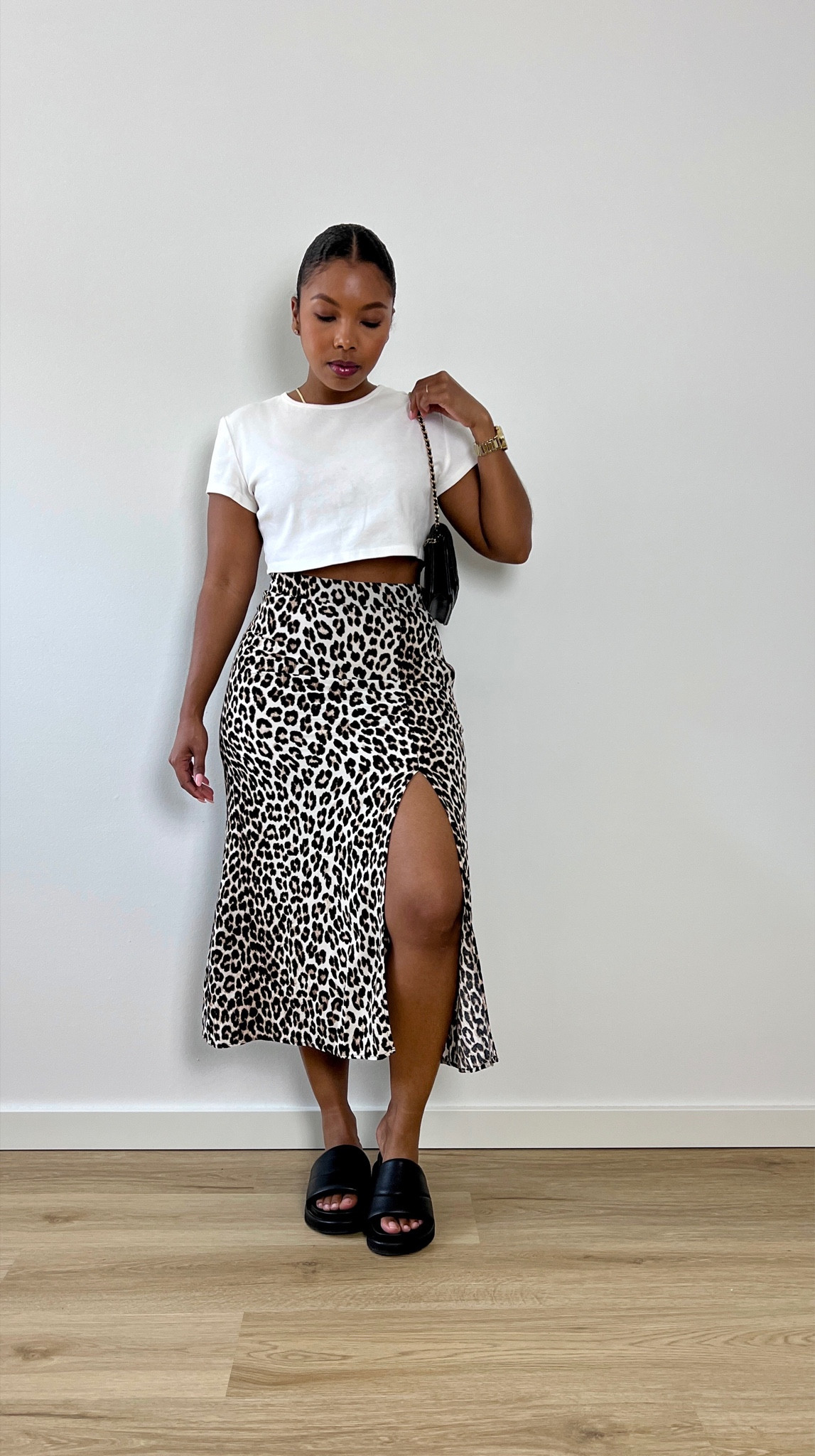 The outfit expertly pairs a classic white tee with a bold leopard print skirt, creating a chic contrast of simplicity and pattern. The high slit of the skirt adds a touch of elegance and edginess, while the black accessories round out the look with a cohesive touch.