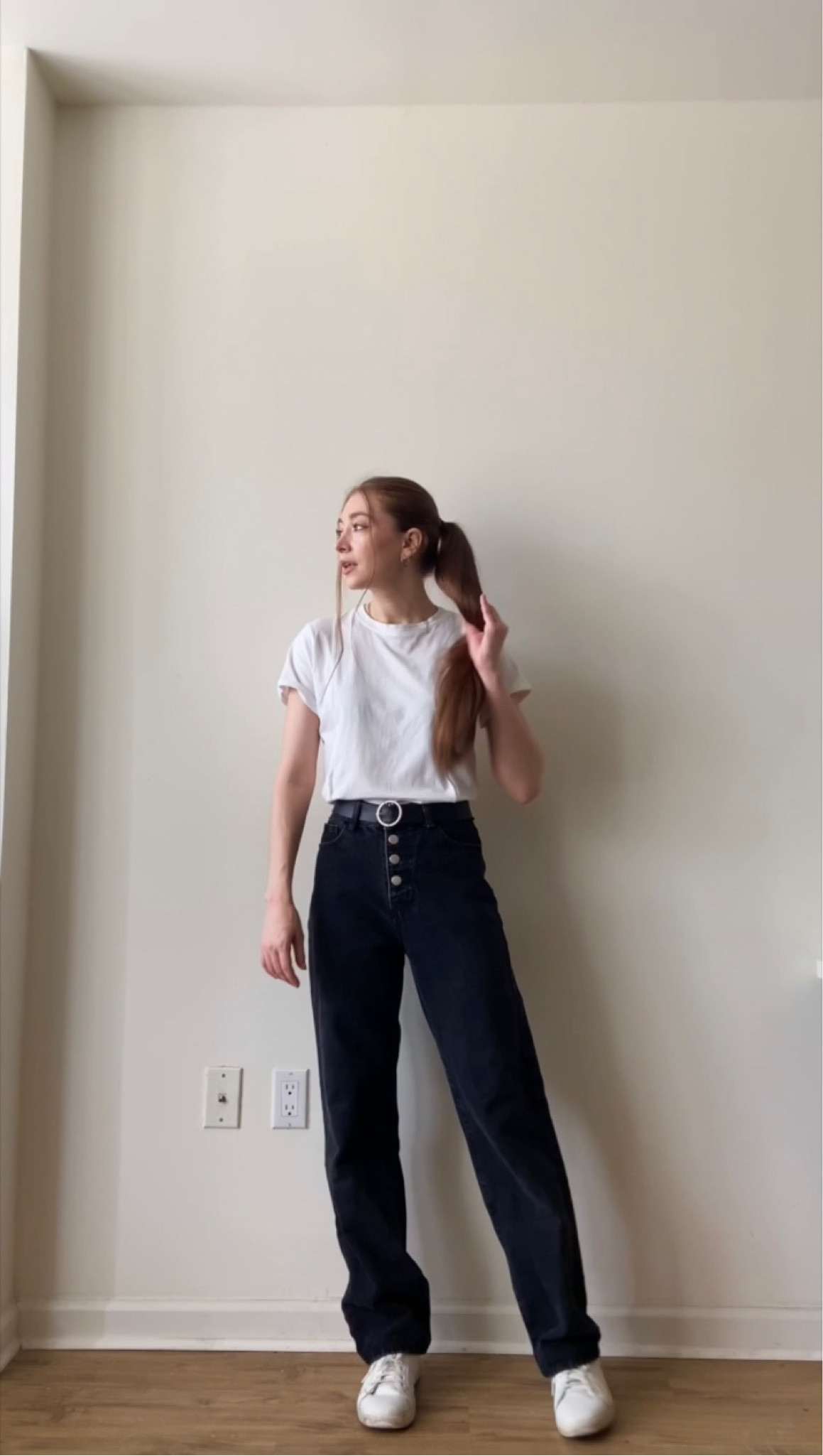 The classic combination of a crisp white tee and high-waisted dark jeans creates a timeless, effortlessly chic look. The simplicity of the outfit is its strength, providing a clean canvas for personal style while the fitted top and wide-legged pants silhouette is flattering and on-trend.