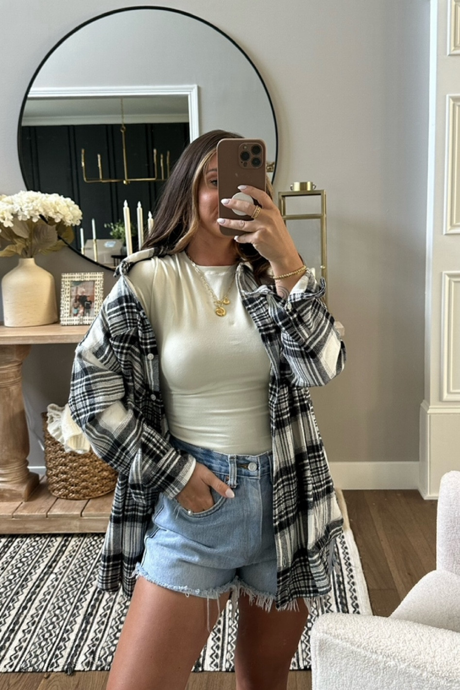 This ensemble presents a perfect balance of casual and chic with the distressed denim shorts offering a laid-back vibe, while the layered flannel adds a touch of grunge-inspired style. The form-fitting, neutral-hued top harmonizes the look, making it versatile and on-trend.