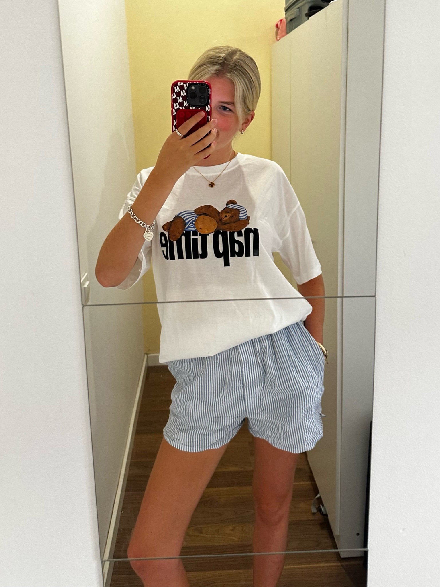 The outfit presents a relaxed yet trendy vibe with a playful graphic tee that adds character, paired nicely with striped shorts that offer a classic summer feel. The overall look is harmoniously casual and exhibits a comfortable, yet stylish aesthetic suitable for a variety of laid-back settings.
