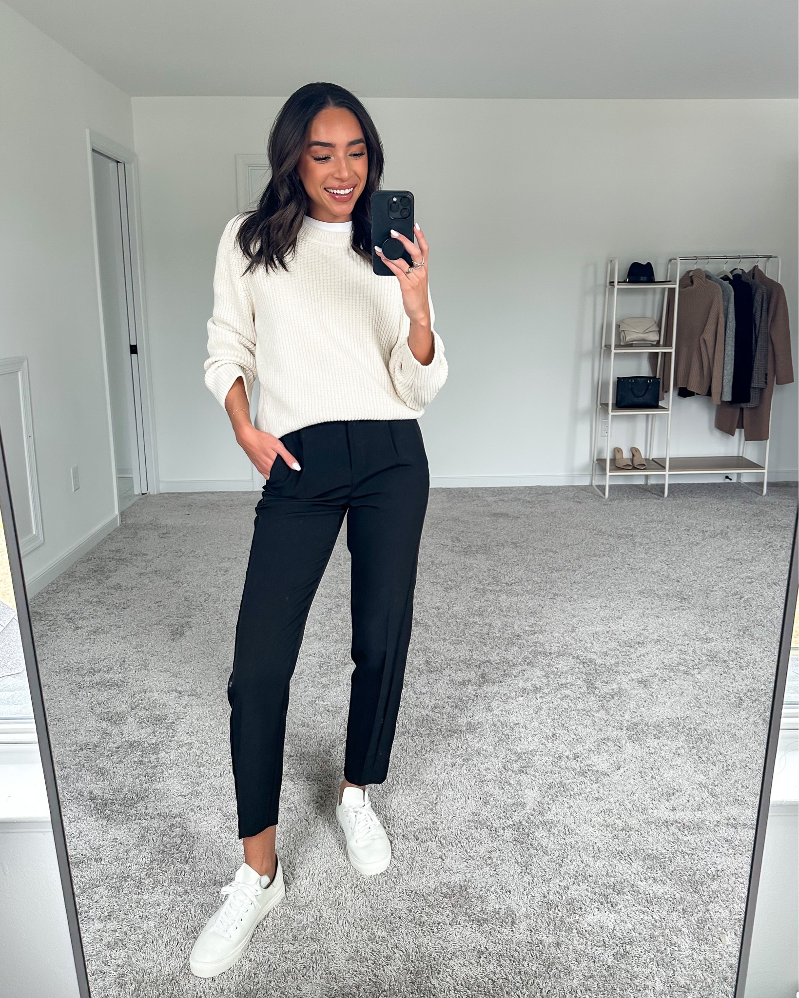 The outfit expertly combines comfort with style; the chunky knit sweater adds texture and a cozy vibe, while the tailored black trousers provide a sleek contrast that’s smartly casual. Crisp white sneakers round off the ensemble with a trendy, laid-back finish, signifying effortless chic.
