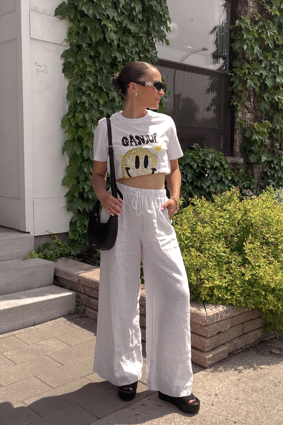 The high-waisted, wide-leg trousers elongate the silhouette, offering a modern and sophisticated aesthetic, while the graphic tee adds a playful touch, creating a well-balanced juxtaposition between casual and chic. The minimalist accessories—sleek sunglasses and a classic black bag—complement the ensemble without overshadowing the statement pieces.