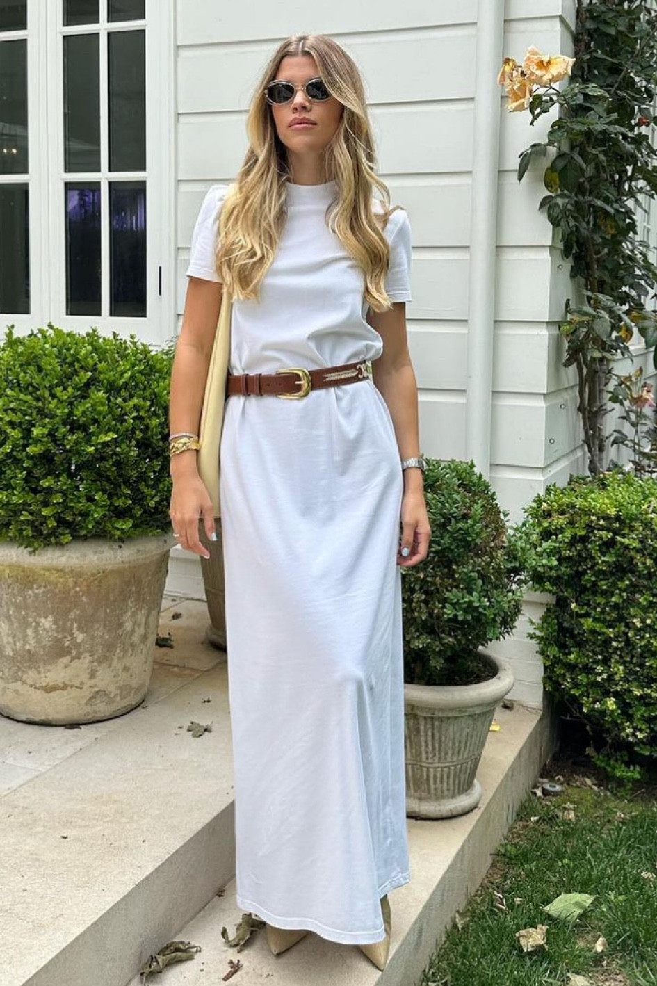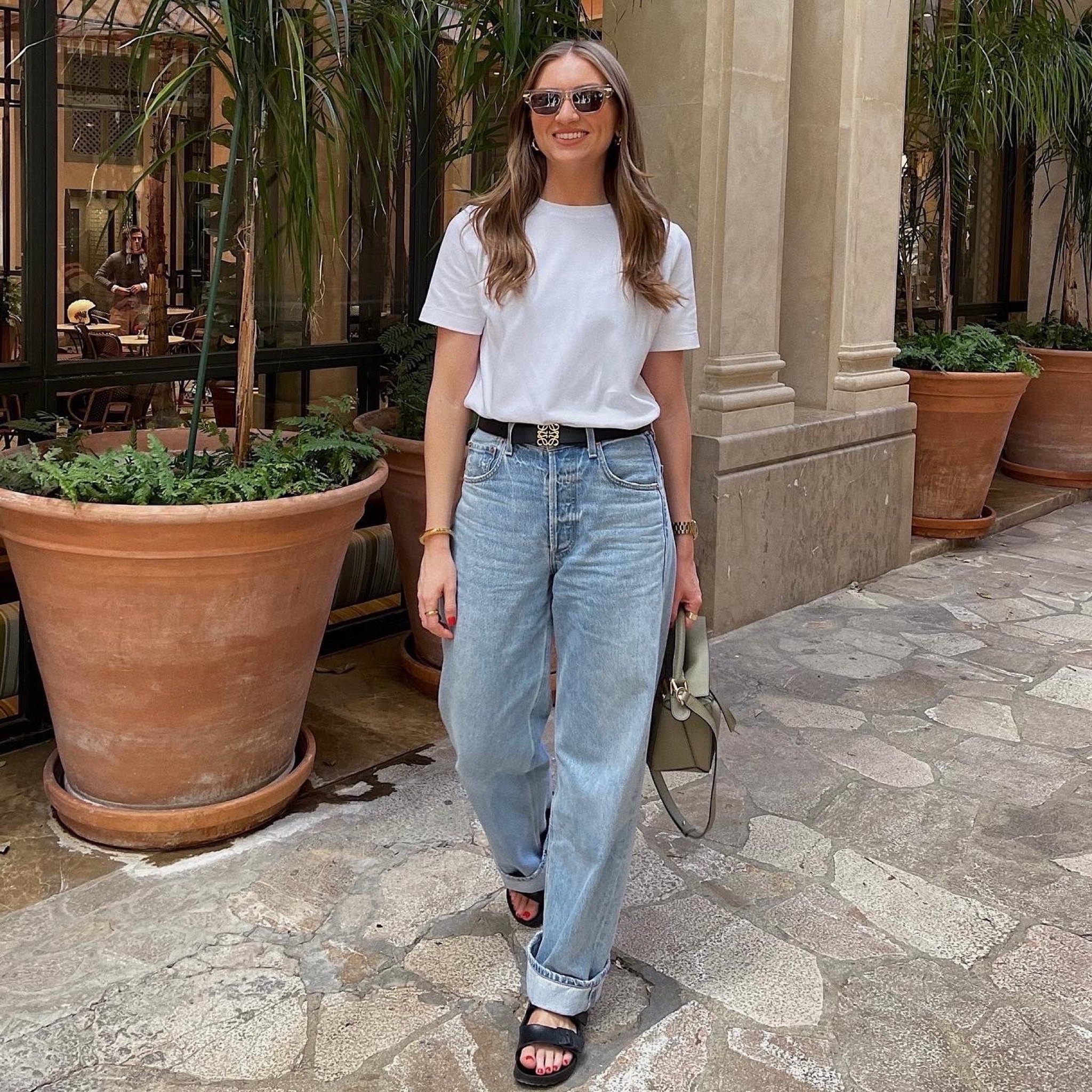 The ensemble strikes a perfect balance between comfort and style, with the classic white tee and high-waisted jeans creating an effortlessly chic look. The addition of the black belt and matching sandals, along with the tasteful accessories, elevate the outfit, making it versatile for both casual and semi-formal settings.
